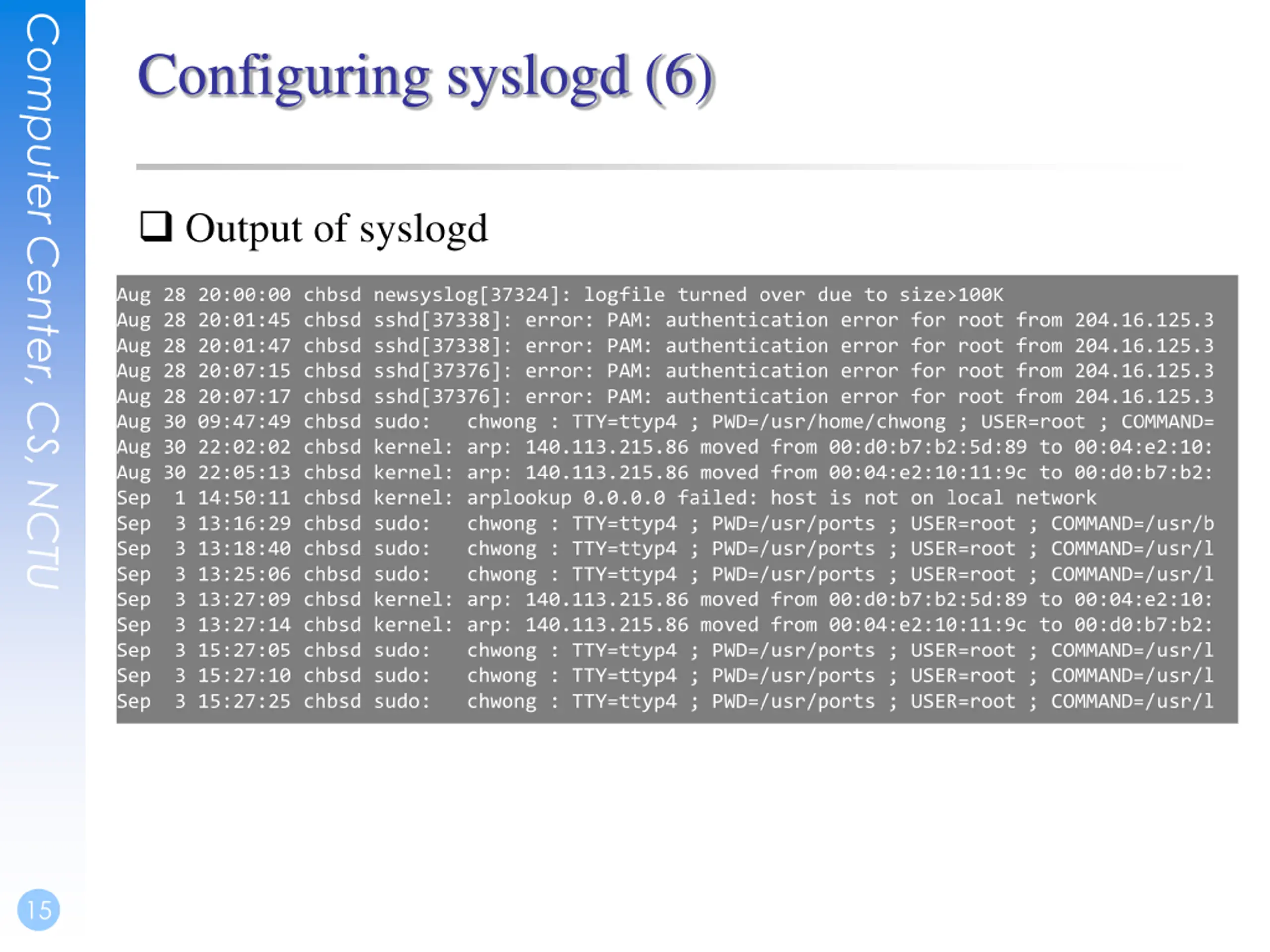 Computer Center, CS, NCTU Configuring syslogd (5) Ex: *.emerg *.err;kern,mark.debug;auth.notice;user.none *.info;kern,user,mark,auth.none *alert;kern.crit;local0,local1,local2.info /dev/console /var/log/console.log @loghost root lpr.err /var/log/console.log @loghost 14