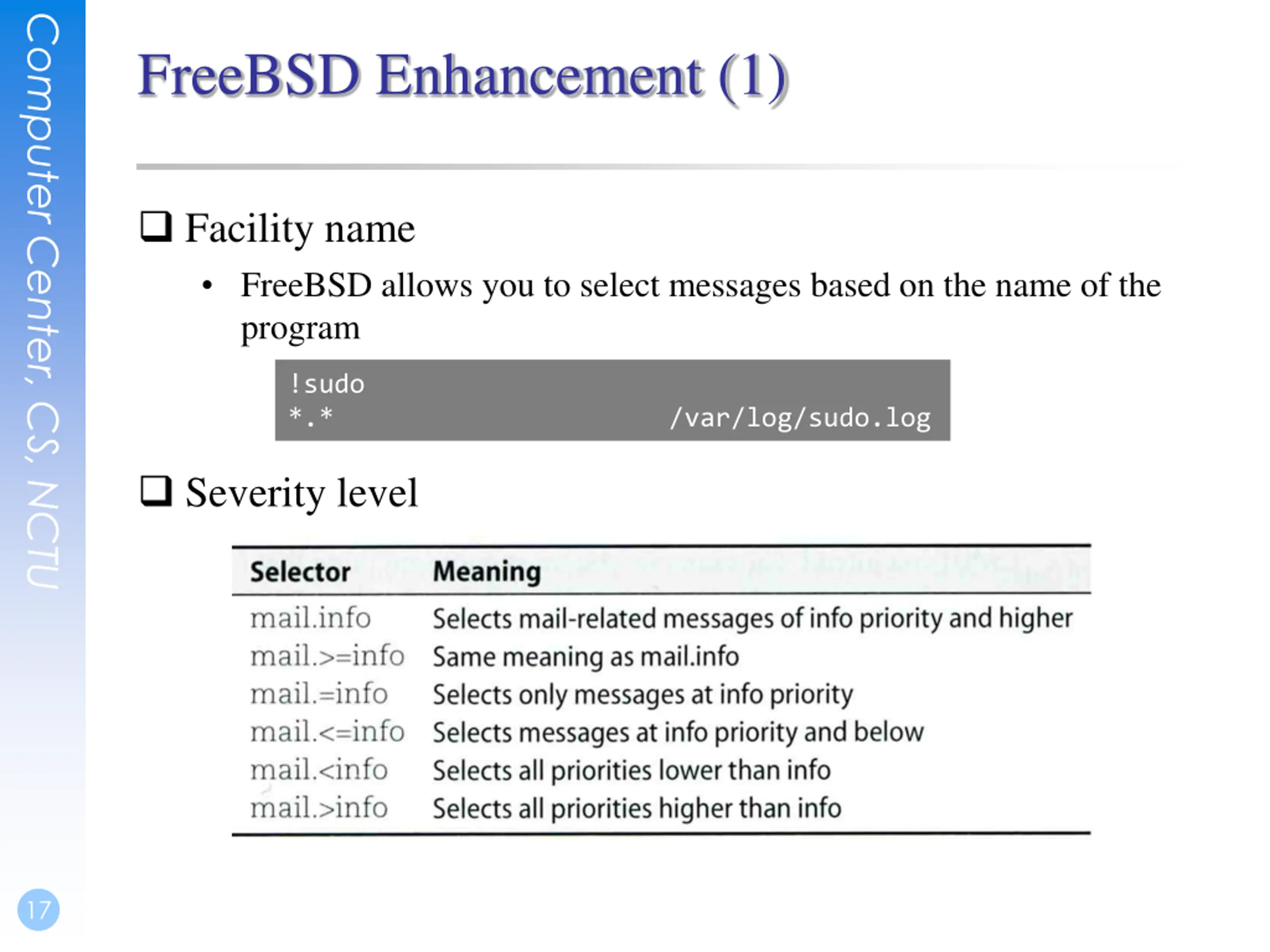 Computer Center, CS, NCTU FreeBSD Enhancement (1) Facility name FreeBSD allows you to select messages based on the name of the program !sudo *.* /var/log/sudo.log Severity level 17