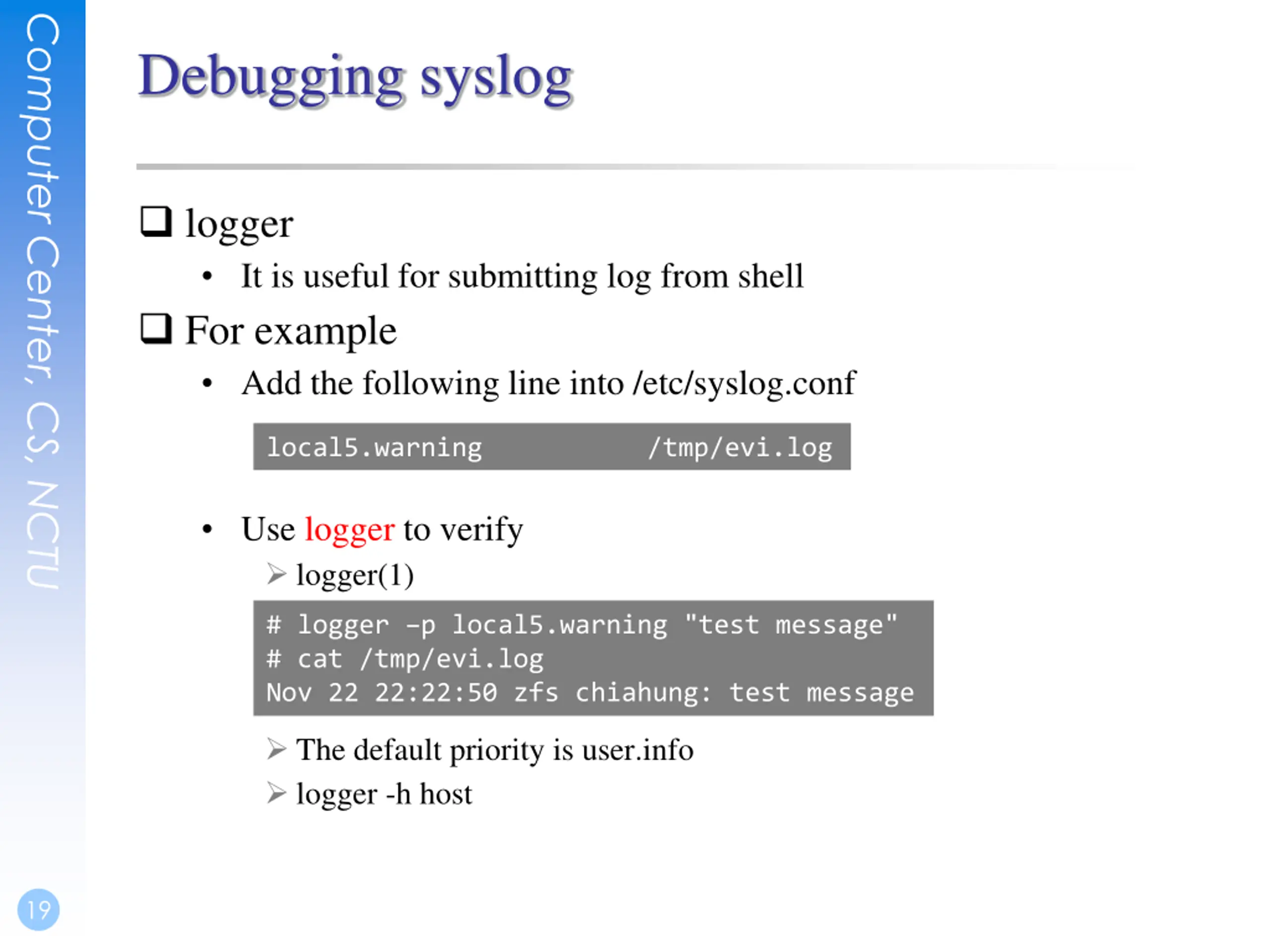 Computer Center, CS, NCTU Debugging syslog logger It is useful for submitting log from shell For example Add the following line into /etc/syslog.conf local5.warning /tmp/evi.log Use logger to verify logger(1) # logger p local5.warning "test message" # cat /tmp/evi.log Nov 22 22:22:50 zfs chiahung: test message The default priority is user.info logger -h host 19