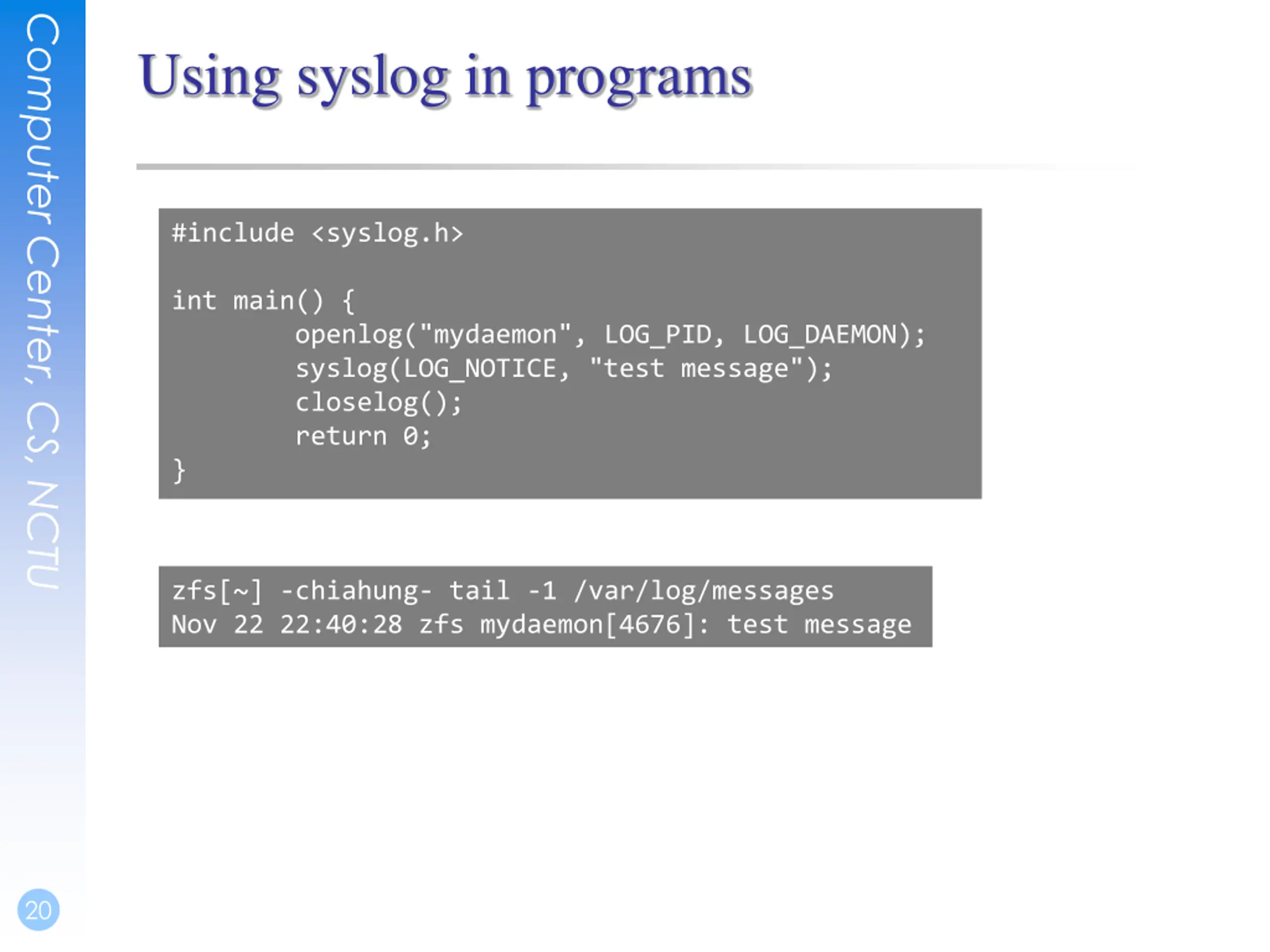 Computer Center, CS, NCTU Using syslog in programs #include <syslog.h> int main() { openlog("mydaemon", LOG_PID, LOG_DAEMON); syslog(LOG_NOTICE, "test message"); closelog(); return 0; } zfs[~] -chiahung- tail -1 /var/log/messages Nov 22 22:40:28 zfs mydaemon[4676]: test message 20