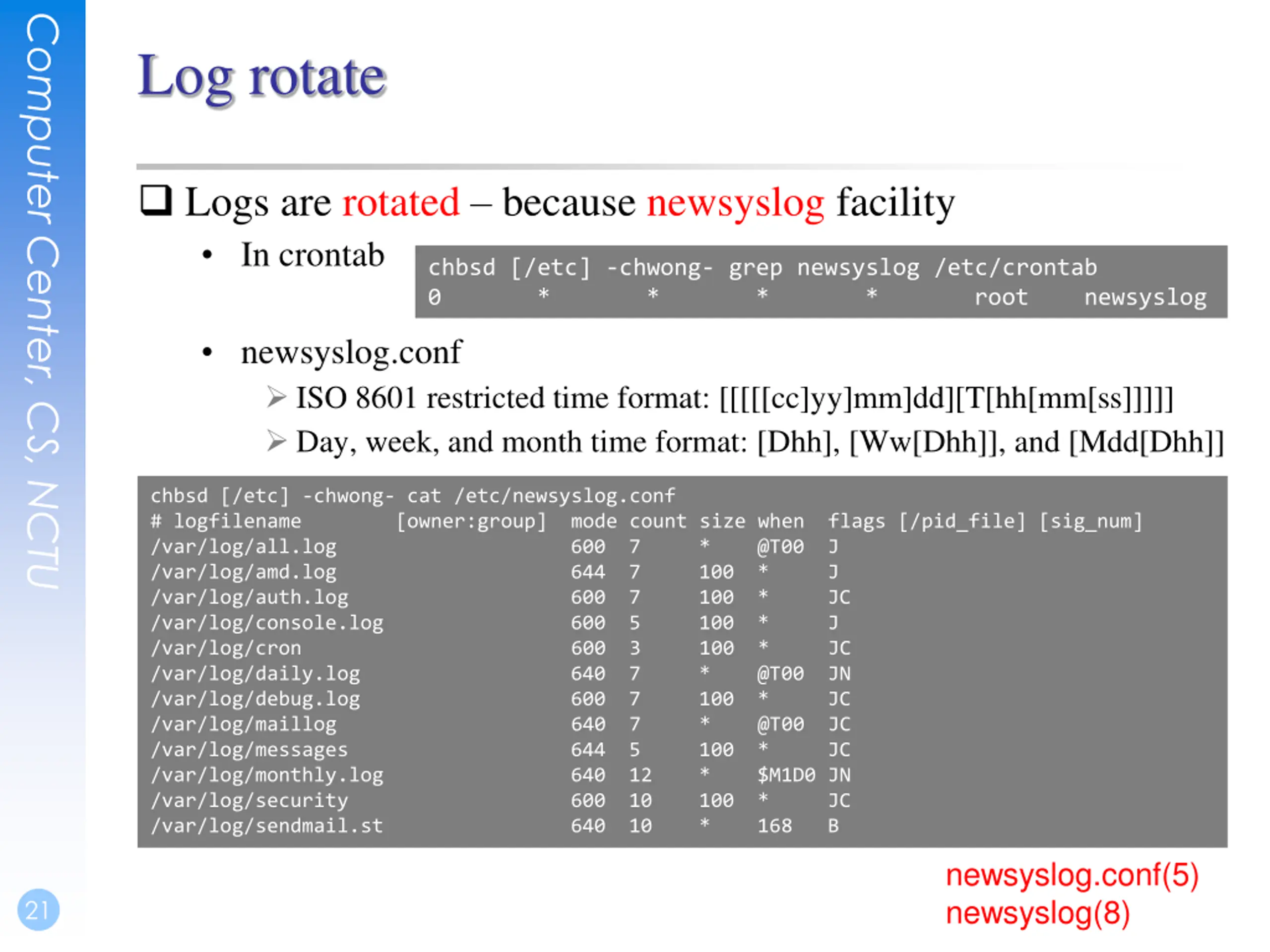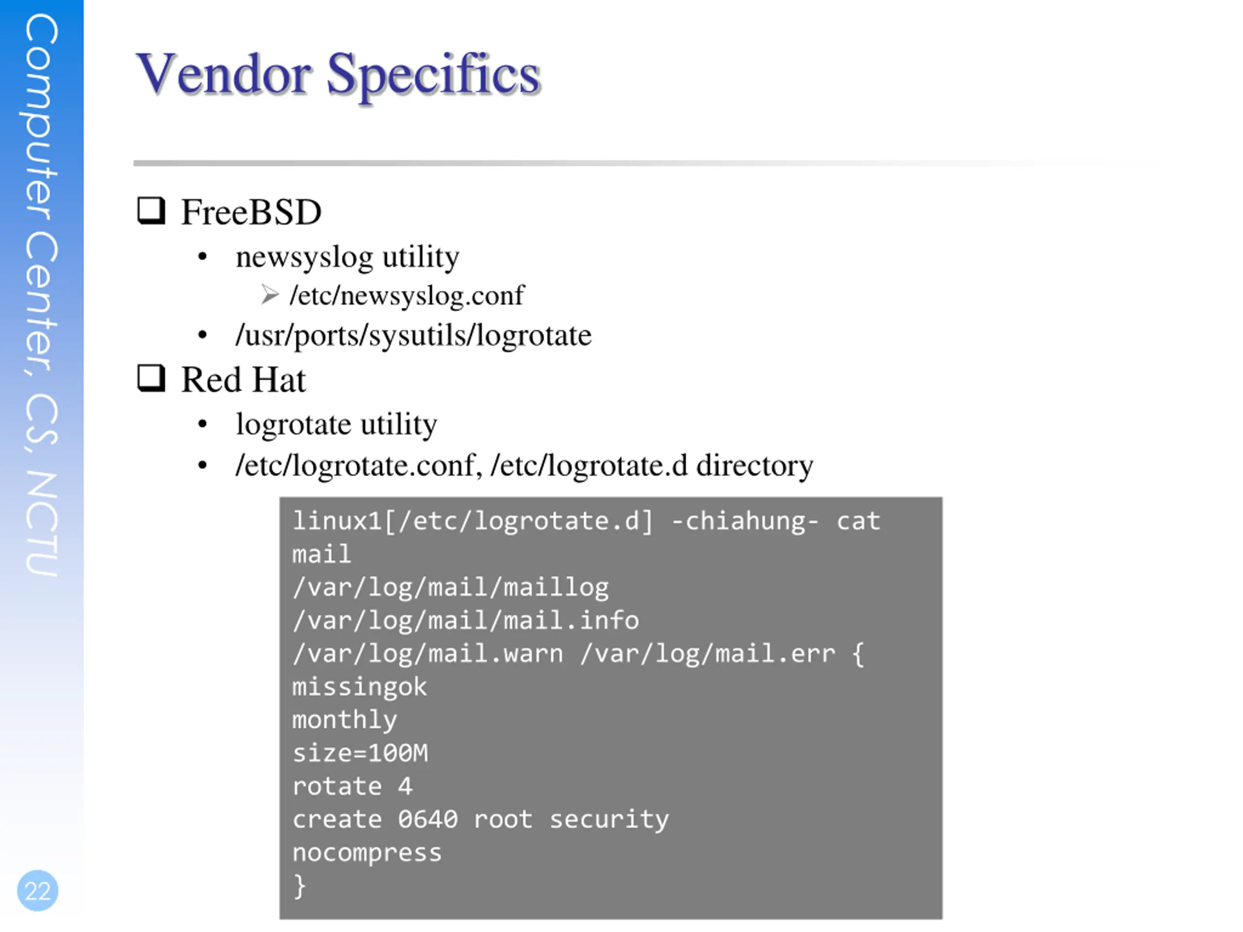 Computer Center, CS, NCTU Log rotate Logs are rotated because newsyslog facility In crontab chbsd [/etc] -chwong- grep newsyslog /etc/crontab 0 * * * * root newsyslog newsyslog.conf ISO 8601 restricted time format: [[[[[cc]yy]mm]dd][T[hh[mm[ss]]]]] Day, week, and month time format: [Dhh], [Ww[Dhh]], and [Mdd[Dhh]] chbsd [/etc] -chwong- cat /etc/newsyslog.conf # logfilename [owner:group] mode count size when flags [/pid_file] [sig_num] /var/log/all.log 600 7 * @T00 J /var/log/amd.log 644 7 100 * J /var/log/auth.log 600 7 100 * JC /var/log/console.log 600 5 100 * J /var/log/cron 600 3 100 * JC /var/log/daily.log 640 7 * @T00 JN /var/log/debug.log 600 7 100 * JC /var/log/maillog 640 7 * @T00 JC /var/log/messages 644 5 100 * JC /var/log/monthly.log 640 12 * $M1D0 JN /var/log/security 600 10 100 * JC /var/log/sendmail.st 640 10 * 168 B newsyslog.conf(5) newsyslog(8) 21