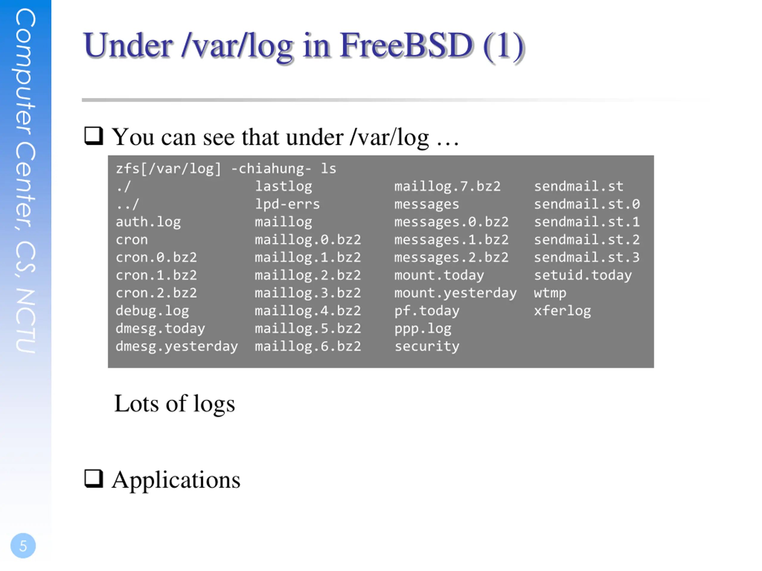 Computer Center, CS, NCTU Finding Log Files Ways and locations Common directory /var/log Read software configuration files Ex: /usr/local/etc/apache22/httpd.conf TransferLog /home/www/logs/access.log Ex: /usr/local/etc/smb.conf log file = /var/log/samba/%m.log See /etc/syslog.conf 4