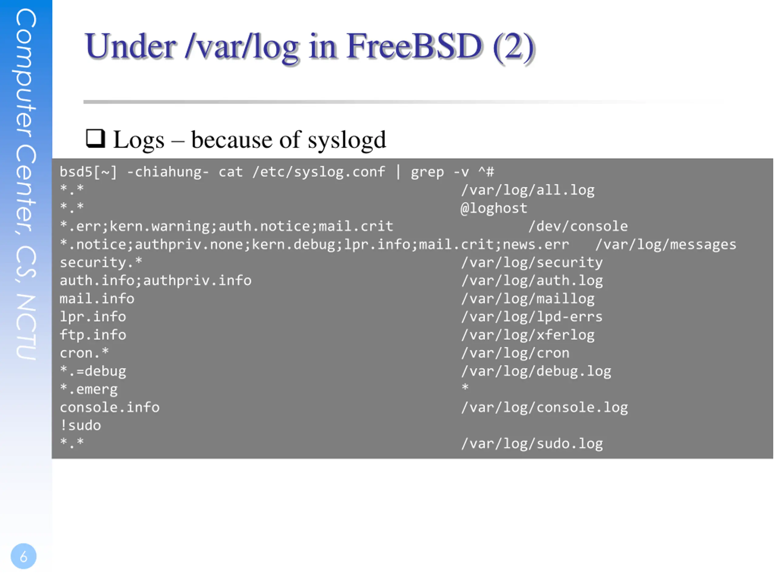 Computer Center, CS, NCTU Under /var/log in FreeBSD (2) Logs because of syslogd bsd5[~] -chiahung- cat /etc/syslog.conf | grep -v ^# *.* /var/log/all.log *.* @loghost *.err;kern.warning;auth.notice;mail.crit *.notice;authpriv.none;kern.debug;lpr.info;mail.crit;news.err security.* /var/log/security auth.info;authpriv.info mail.info /var/log/maillog lpr.info /var/log/lpd-errs ftp.info /var/log/xferlog cron.* /var/log/cron *.=debug /var/log/debug.log *.emerg console.info /var/log/console.log !sudo *.* /var/log/sudo.log /dev/console /var/log/messages /var/log/auth.log * 6