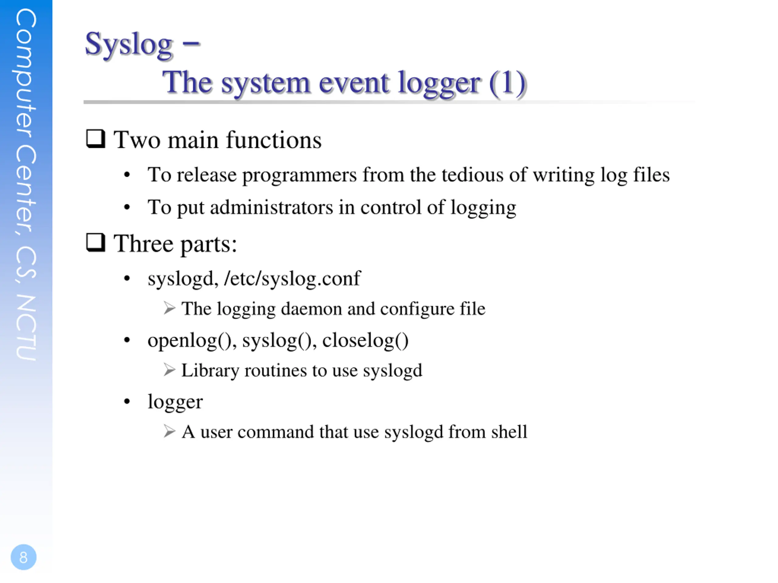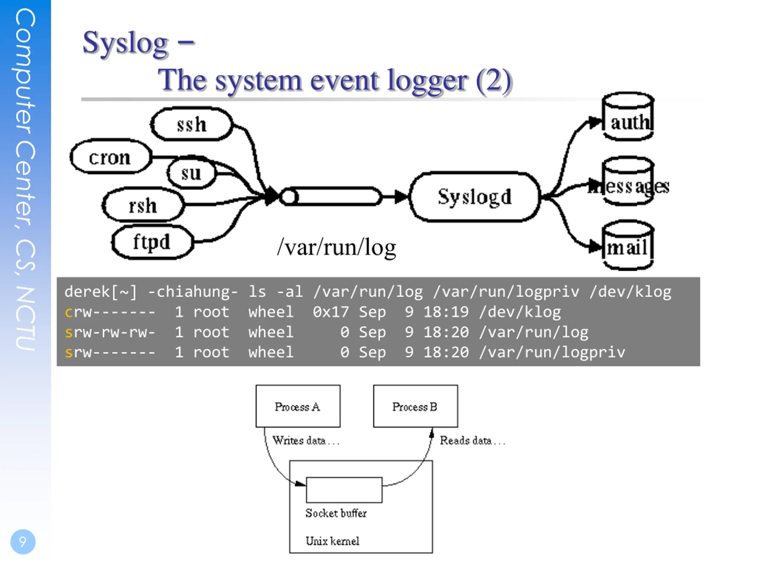 Computer Center, CS, NCTU Syslog The system event logger (1) Two main functions To release programmers from the tedious of writing log files To put administrators in control of logging Three parts: syslogd, /etc/syslog.conf The logging daemon and configure file openlog(), syslog(), closelog() Library routines to use syslogd logger A user command that use syslogd from shell 8