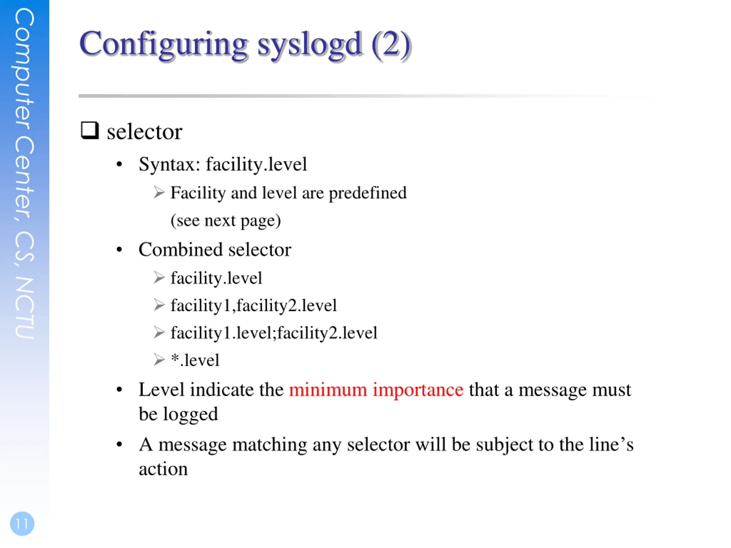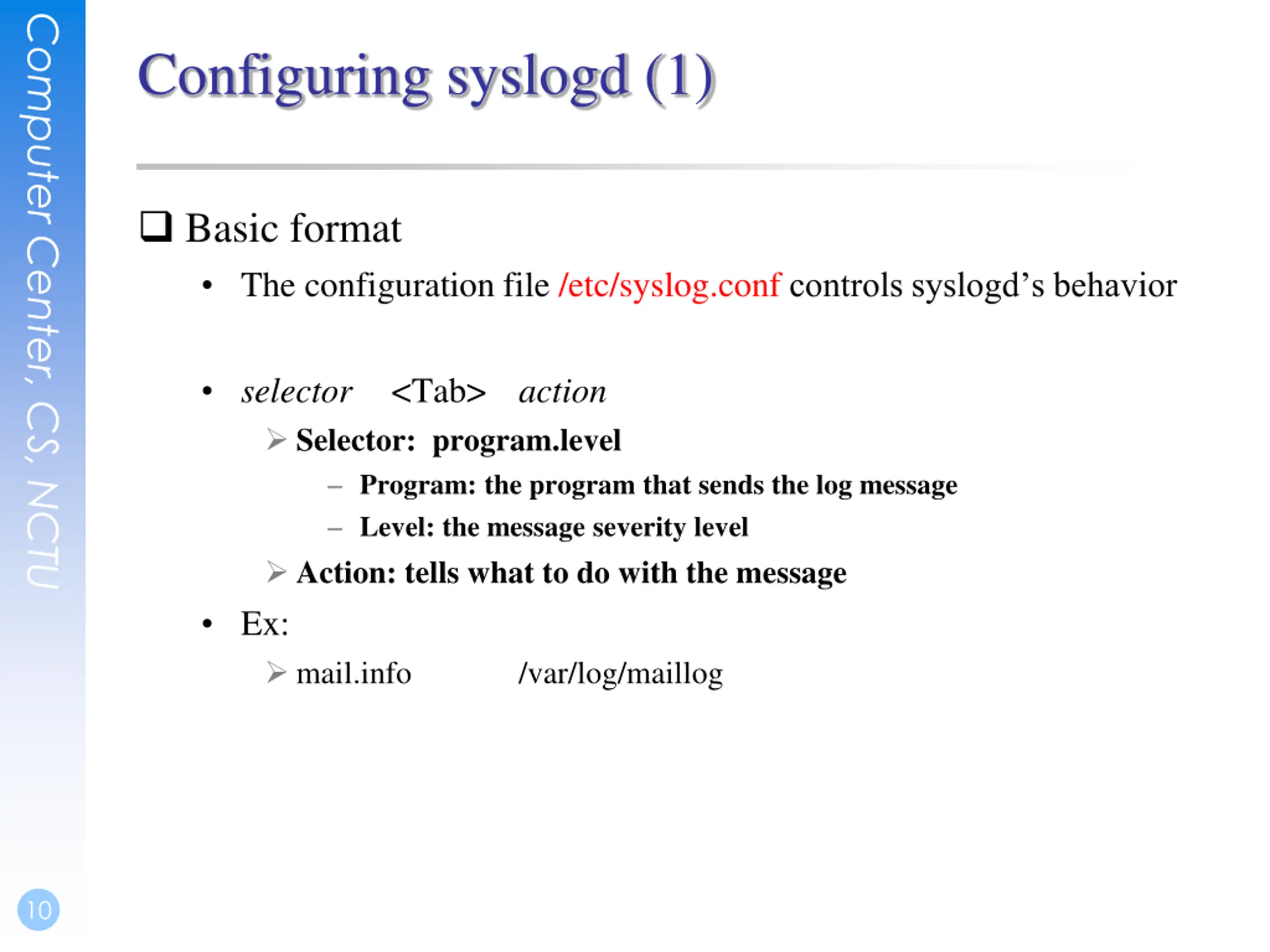 Computer Center, CS, NCTU Configuring syslogd (1) Basic format The configuration file /etc/syslog.conf controls syslogd s behavior <Tab> selector Selector: program.level Program: the program that sends the log message Level: the message severity level Action: tells what to do with the message Ex: mail.info /var/log/maillog action 10