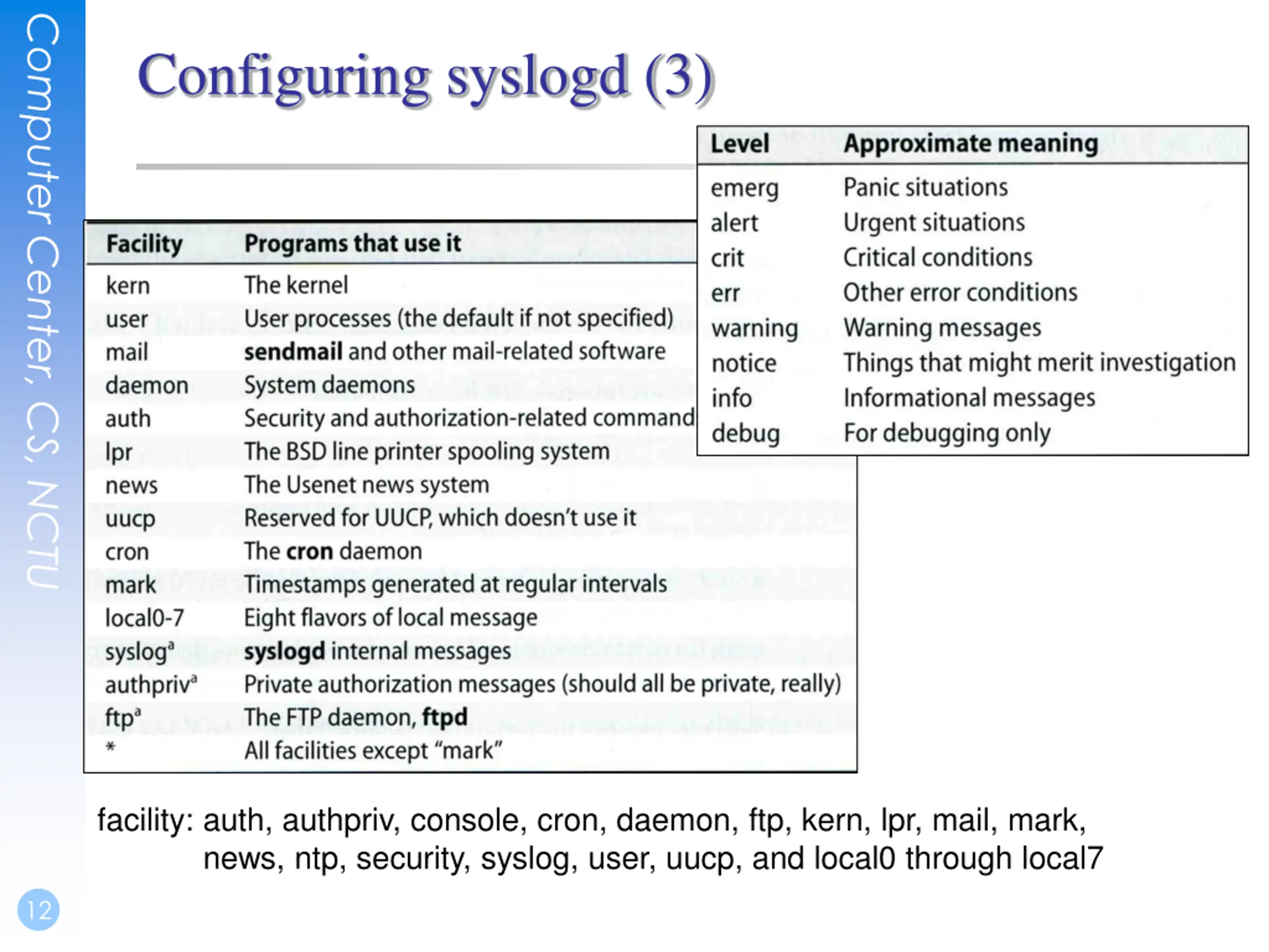 Computer Center, CS, NCTU Configuring syslogd (2) selector Syntax: facility.level Facility and level are predefined (see next page) Combined selector facility.level facility1,facility2.level facility1.level;facility2.level *.level Level indicate the minimum importance that a message must be logged A message matching any selector will be subject to the line s action 11