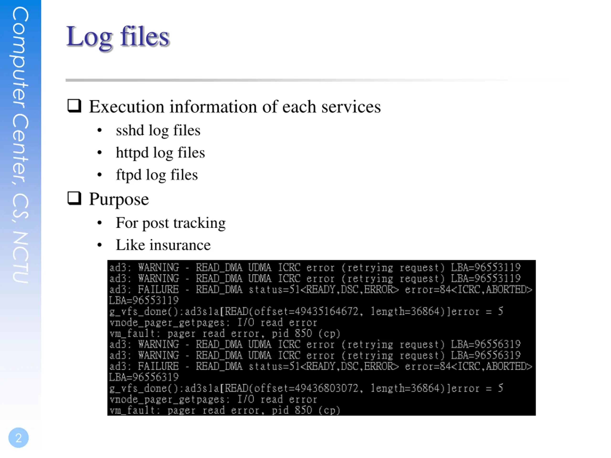 Computer Center, CS, NCTU Log files Execution information of each services sshd log files httpd log files ftpd log files Purpose For post tracking Like insurance 2