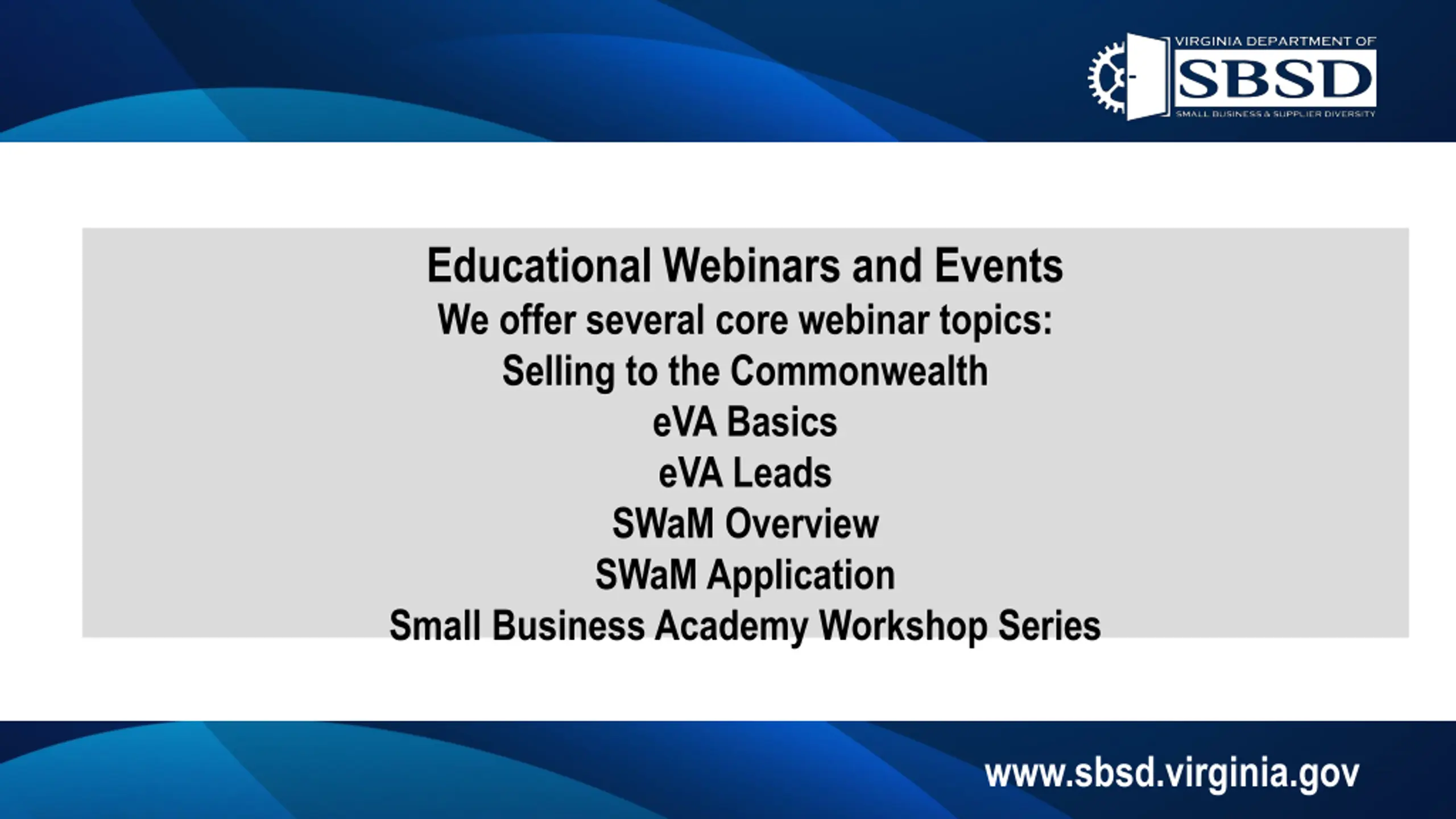 Educational Webinars and Events We offer several core webinar topics: Selling to the Commonwealth eVA Basics eVA Leads SWaM Overview SWaM Application Small Business Academy Workshop Series www.sbsd.virginia.gov