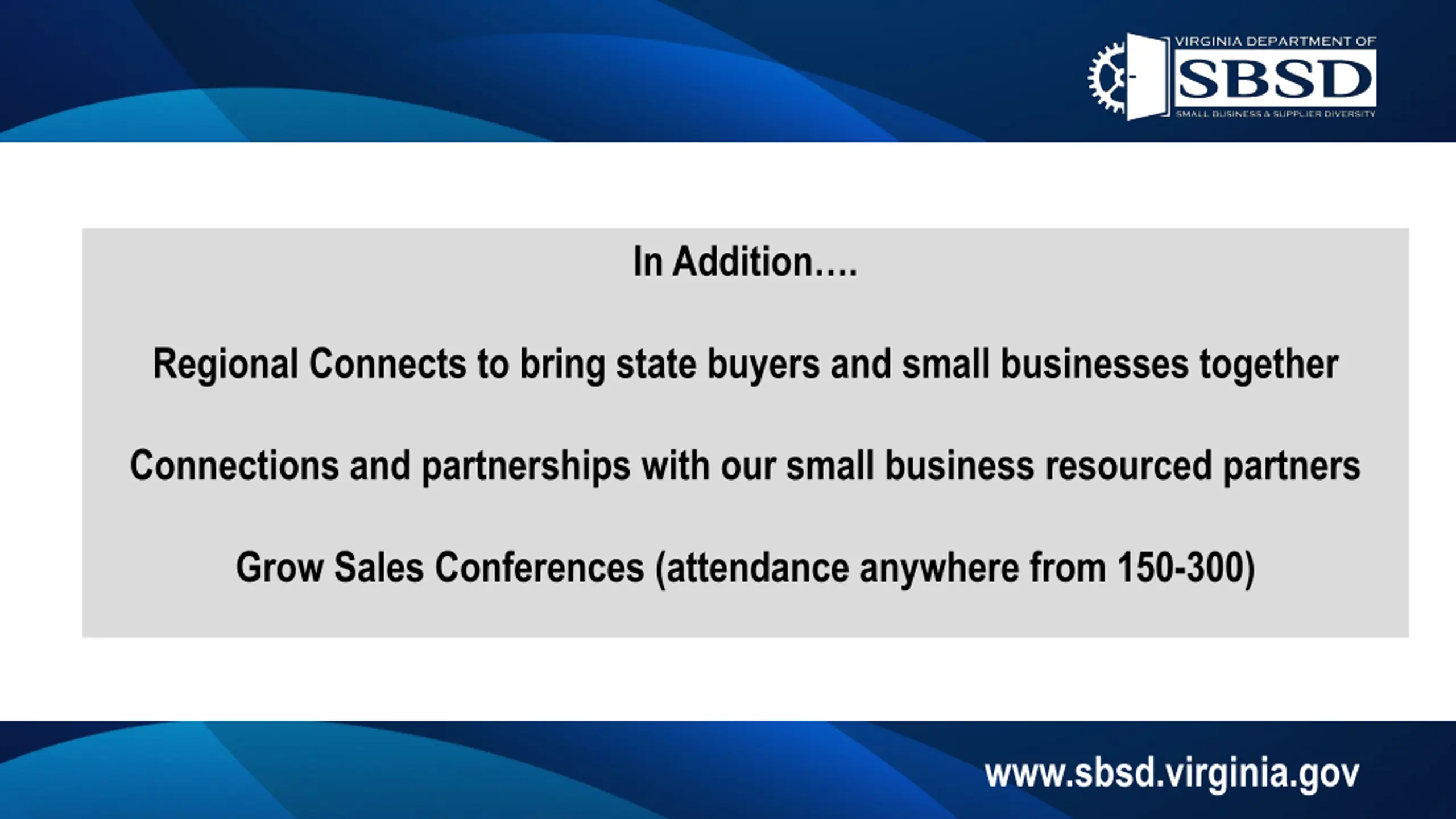 In Addition. Regional Connects to bring state buyers and small businesses together Connections and partnerships with our small business resourced partners Grow Sales Conferences (attendance anywhere from 150-300) www.sbsd.virginia.gov