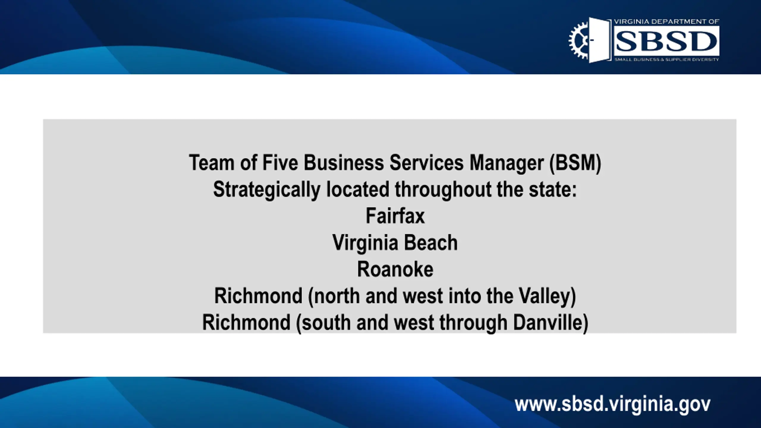 Team of Five Business Services Manager (BSM) Strategically located throughout the state: Fairfax Virginia Beach Roanoke Richmond (north and west into the Valley) Richmond (south and west through Danville) www.sbsd.virginia.gov