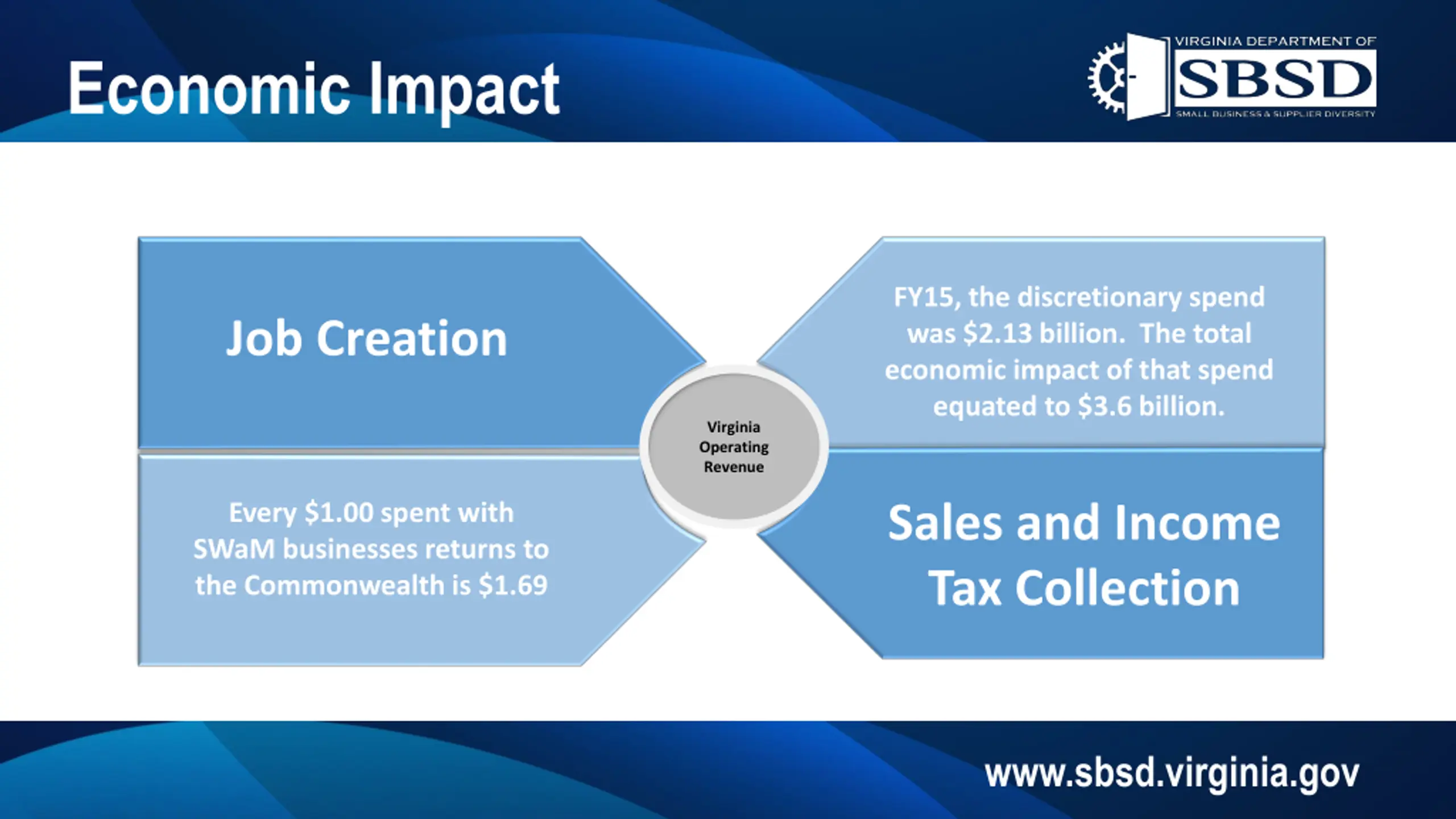 Economic Impact FY15, the discretionary spend was $2.13 billion. The total economic impact of that spend equated to $3.6 billion. Job Creation Virginia Operating Revenue Sales and Income Tax Collection Every $1.00 spent with SWaM businesses returns to the Commonwealth is $1.69 www.sbsd.virginia.gov