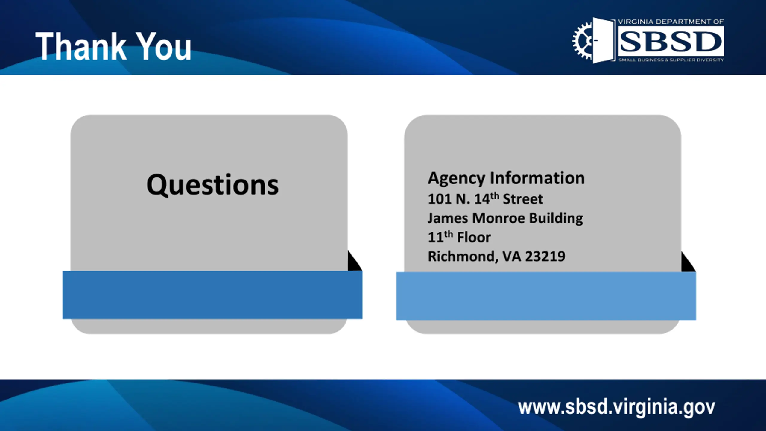 Thank You Agency Information 101 N. 14th Street James Monroe Building 11th Floor Richmond, VA 23219 Questions www.sbsd.virginia.gov