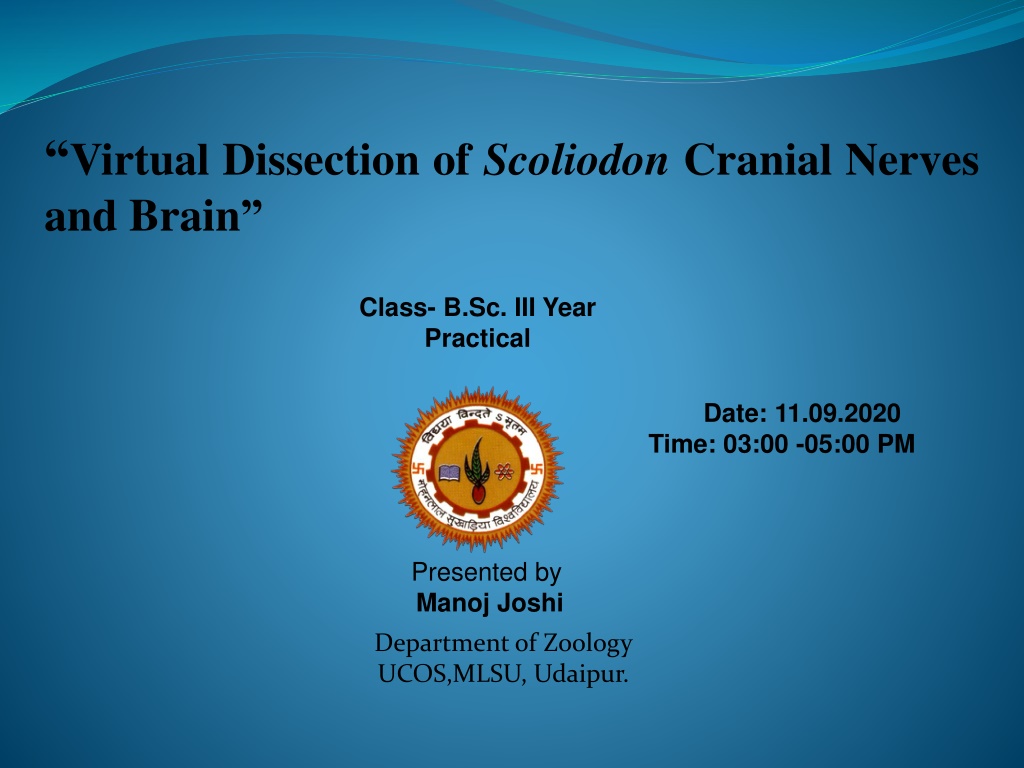 Virtual Dissection of Scoliodon Cranial Nerves and Brain Class- B.Sc. III Year Practical Date: 11.09.2020 Time: 03:00 -05:00 PM Presented by Manoj Joshi Department of Zoology UCOS,MLSU, Udaipur.