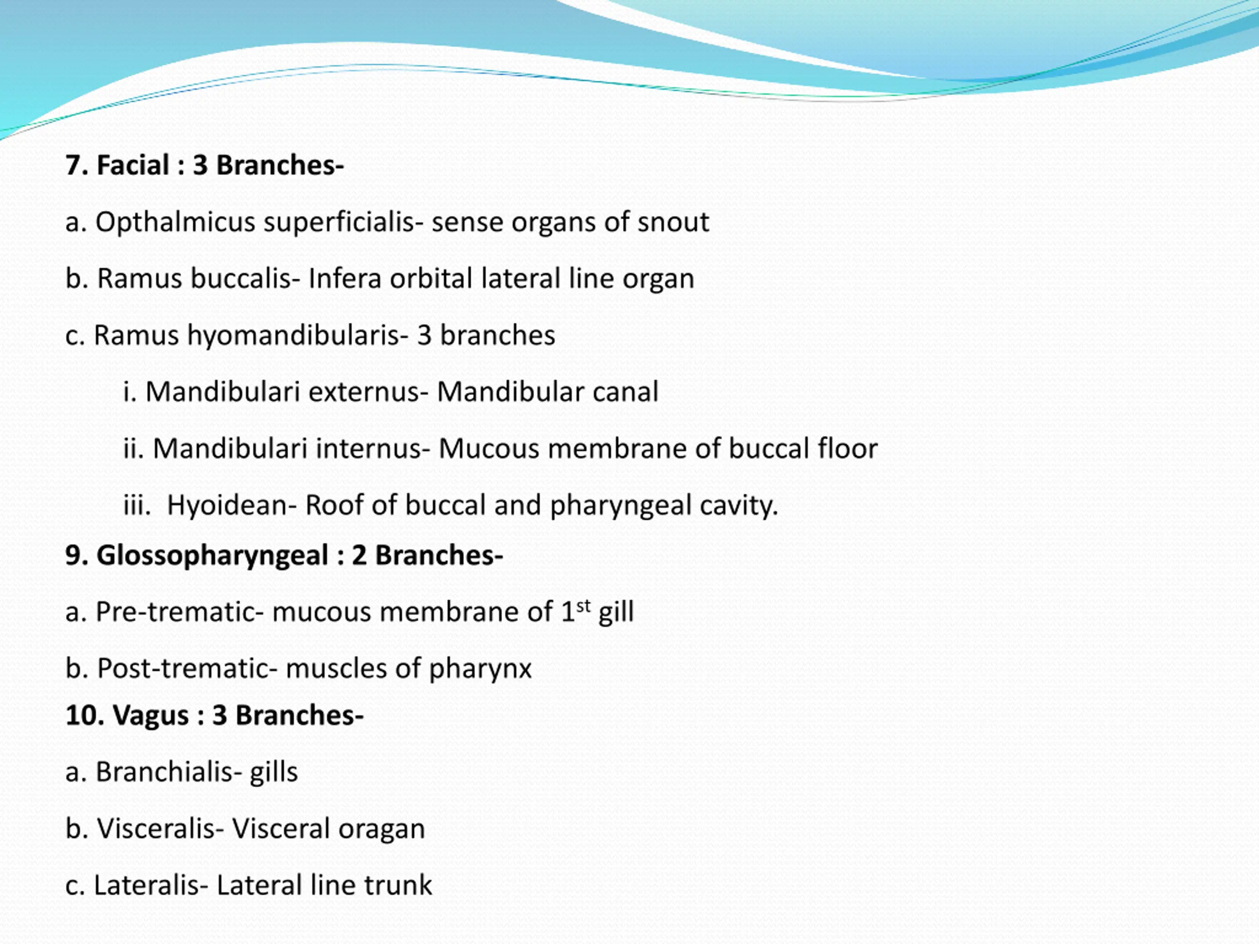 7. Facial : 3 Branches- a. Opthalmicus superficialis- sense organs of snout b. Ramus buccalis- Infera orbital lateral line organ c. Ramus hyomandibularis- 3 branches i. Mandibulari externus- Mandibular canal ii. Mandibulari internus- Mucous membrane of buccal floor iii. Hyoidean- Roof of buccal and pharyngeal cavity. 9. Glossopharyngeal : 2 Branches- a. Pre-trematic- mucous membrane of 1st gill b. Post-trematic- muscles of pharynx 10. Vagus : 3 Branches- a. Branchialis- gills b. Visceralis- Visceral oragan c. Lateralis- Lateral line trunk