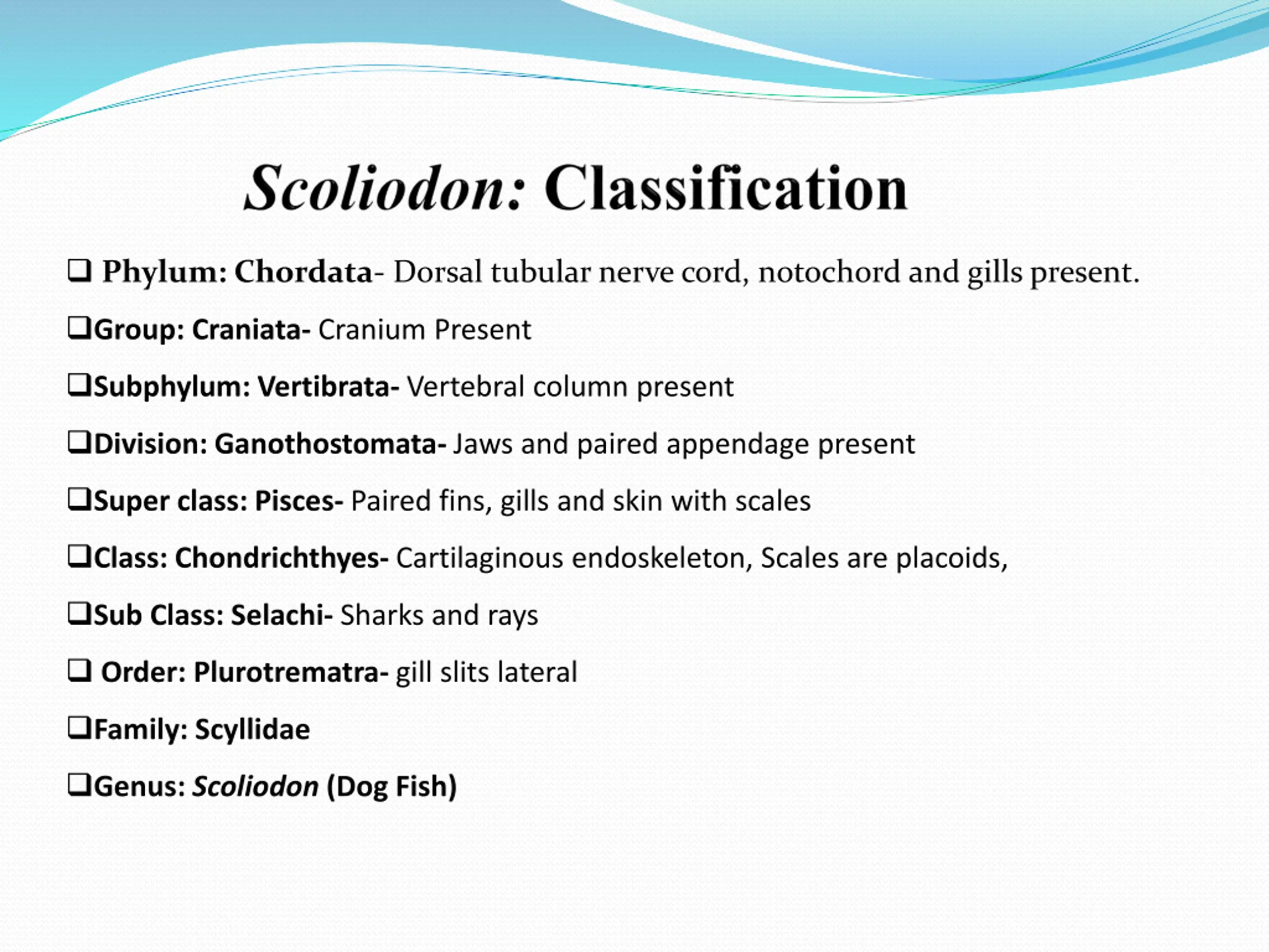Phylum: Chordata- Dorsal tubular nerve cord, notochord and gills present. Group: Craniata- Cranium Present Subphylum: Vertibrata- Vertebral column present Division: Ganothostomata- Jaws and paired appendage present Super class: Pisces- Paired fins, gills and skin with scales Class: Chondrichthyes- Cartilaginous endoskeleton, Scales are placoids, Sub Class: Selachi- Sharks and rays Order: Plurotrematra- gill slits lateral Family: Scyllidae Genus: Scoliodon (Dog Fish)