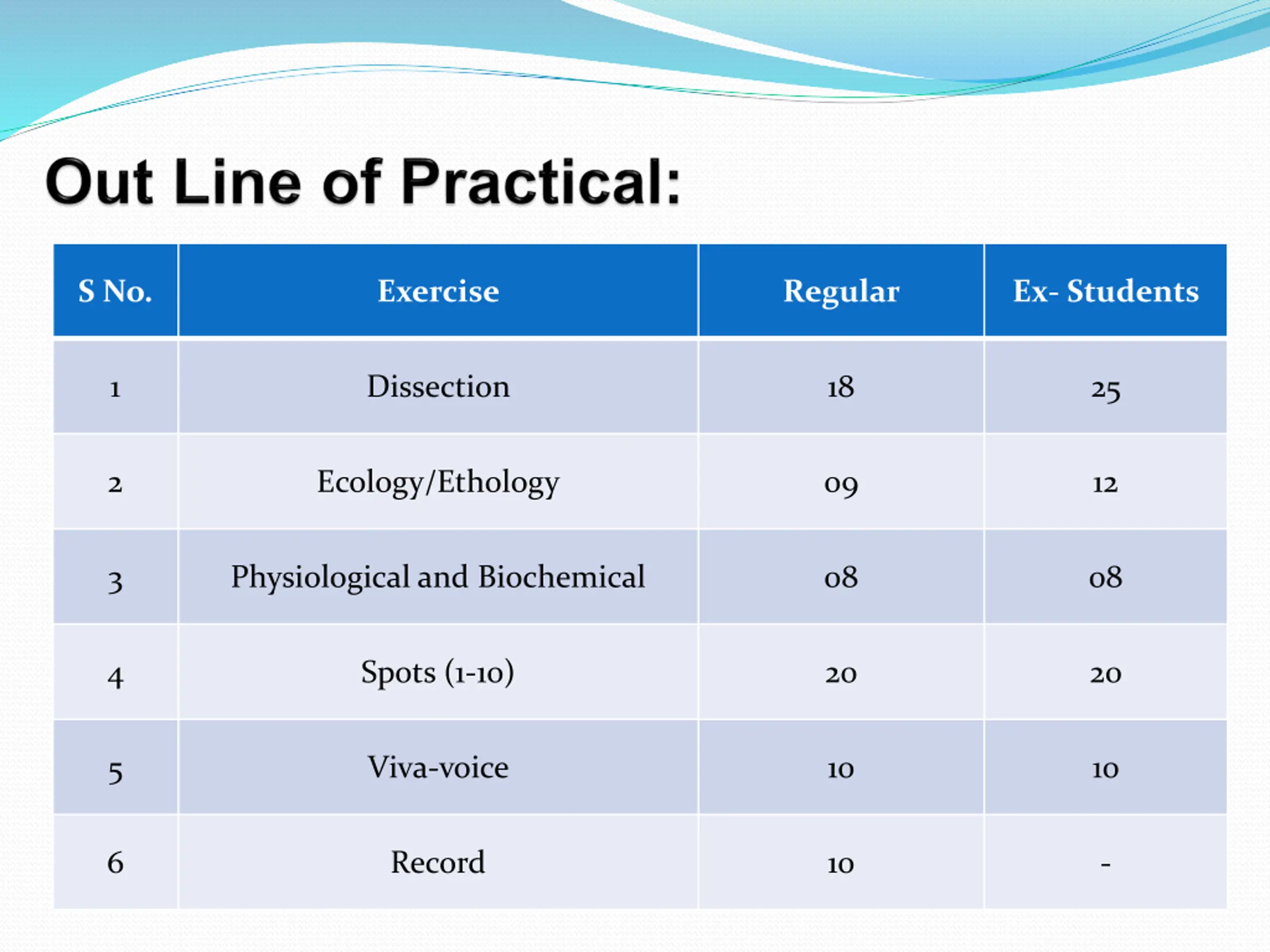 S No. Exercise Regular Ex- Students 1 Dissection 18 25 2 Ecology/Ethology 09 12 3 Physiological and Biochemical 08 08 4 Spots (1-10) 20 20 5 Viva-voice 10 10 6 Record 10 -