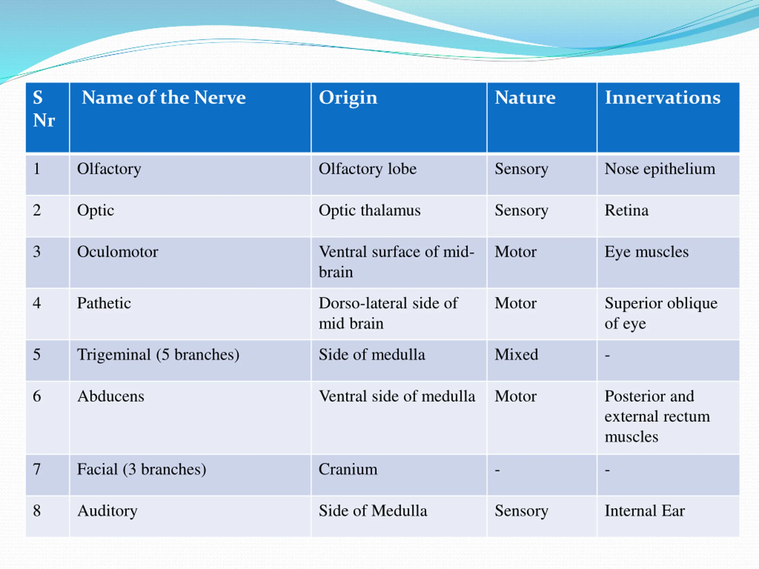 S Nr Name of the Nerve Origin Nature Innervations 1 Olfactory Olfactory lobe Sensory Nose epithelium 2 Optic Optic thalamus Sensory Retina 3 Oculomotor Ventral surface of mid- brain Motor Eye muscles 4 Pathetic Dorso-lateral side of mid brain Motor Superior oblique of eye 5 Trigeminal (5 branches) Side of medulla Mixed - 6 Abducens Ventral side of medulla Motor Posterior and external rectum muscles 7 Facial (3 branches) Cranium - - 8 Auditory Side of Medulla Sensory Internal Ear