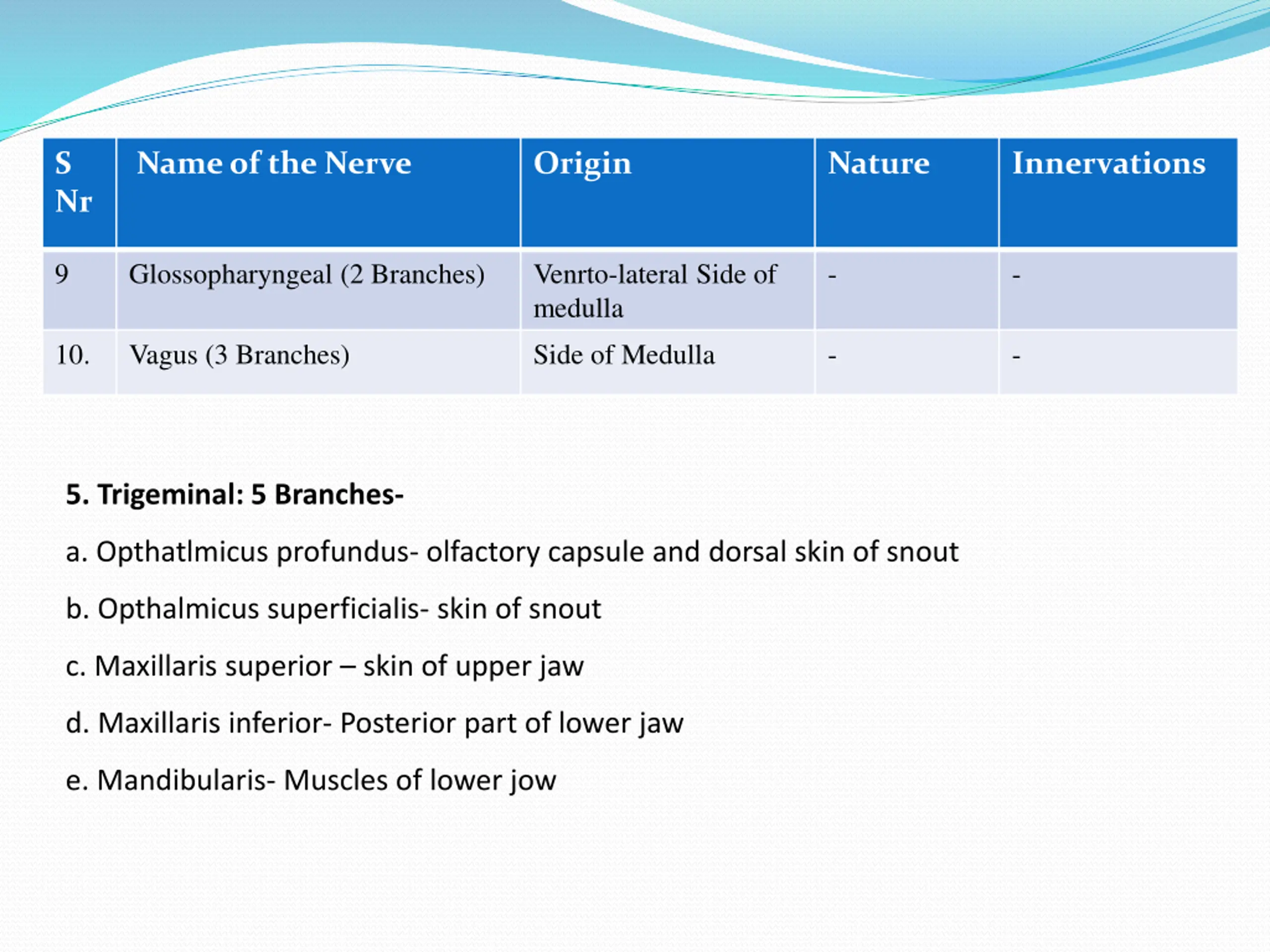 S Nr Name of the Nerve Origin Nature Innervations 9 Glossopharyngeal (2 Branches) Venrto-lateral Side of medulla - - 10. Vagus (3 Branches) Side of Medulla - - 5. Trigeminal: 5 Branches- a. Opthatlmicus profundus- olfactory capsule and dorsal skin of snout b. Opthalmicus superficialis- skin of snout c. Maxillaris superior skin of upper jaw d. Maxillaris inferior- Posterior part of lower jaw e. Mandibularis- Muscles of lower jow