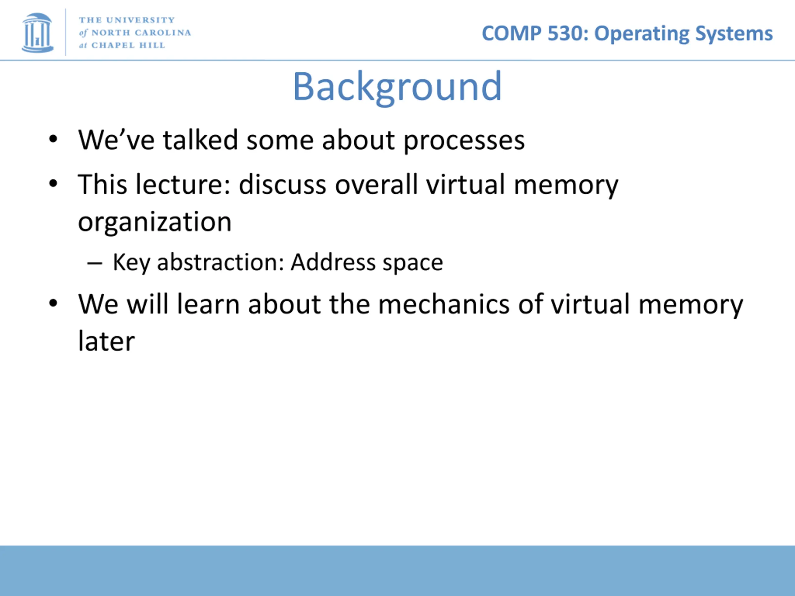 COMP 530: Operating Systems Background We ve talked some about processes This lecture: discuss overall virtual memory organization Key abstraction: Address space We will learn about the mechanics of virtual memory later