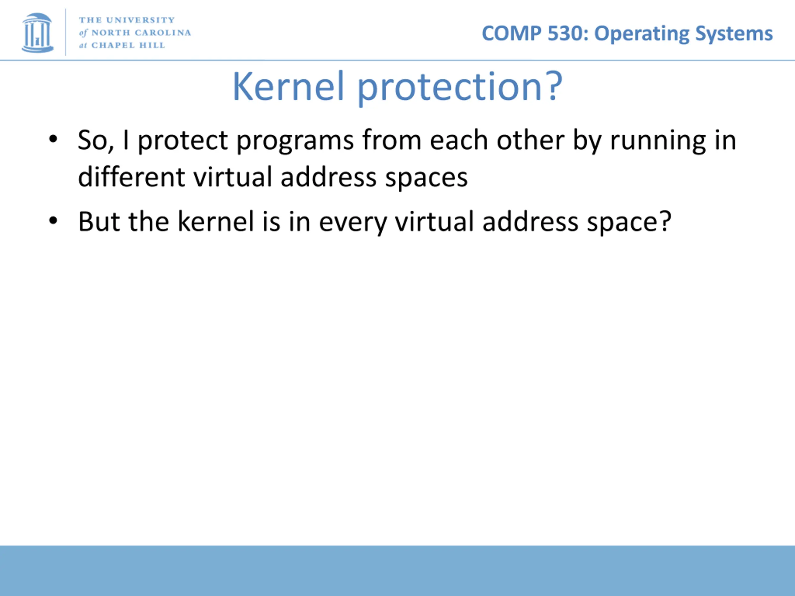 COMP 530: Operating Systems Kernel protection? So, I protect programs from each other by running in different virtual address spaces But the kernel is in every virtual address space?