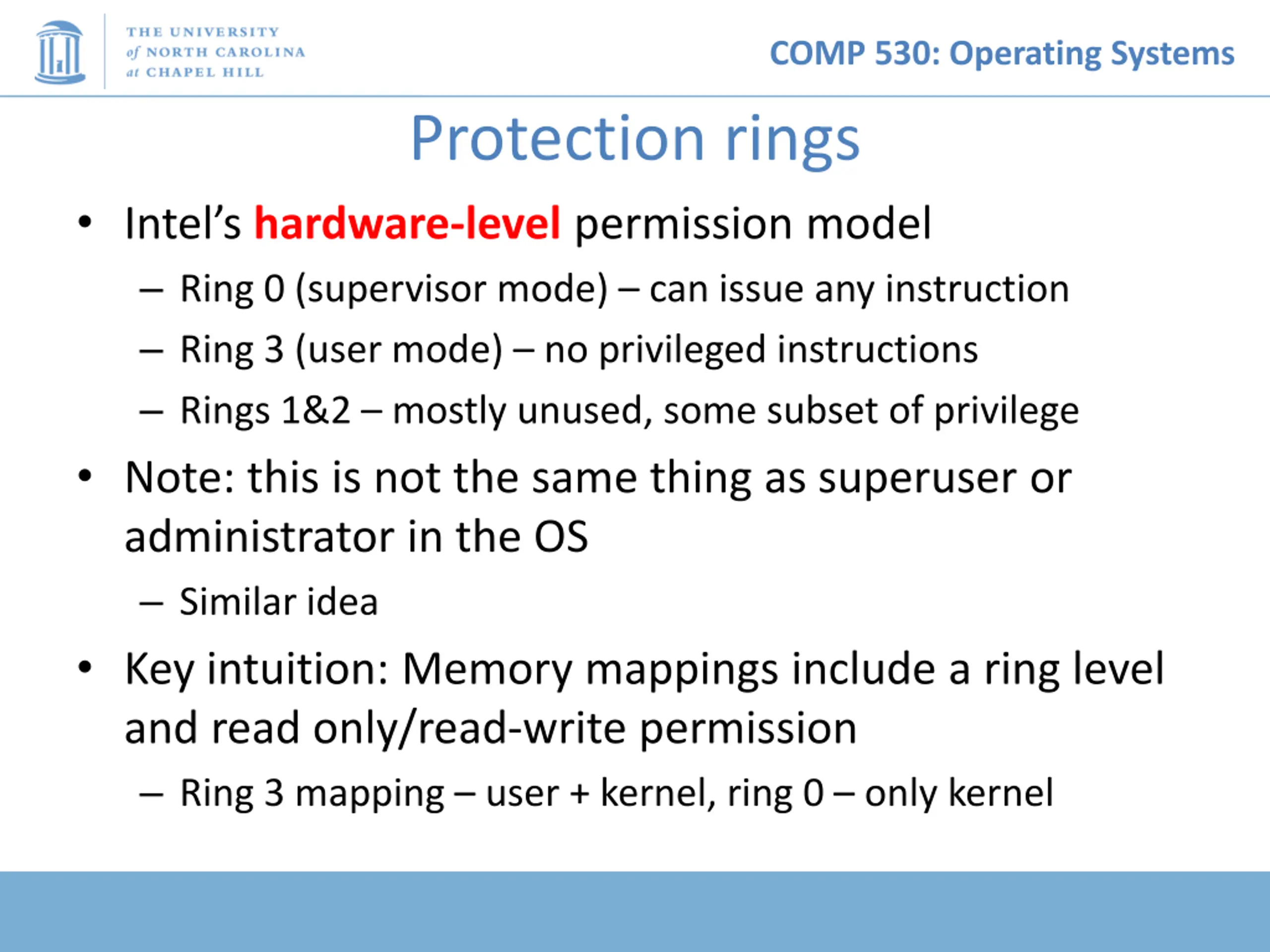 COMP 530: Operating Systems Protection rings Intel s hardware-level permission model Ring 0 (supervisor mode) can issue any instruction Ring 3 (user mode) no privileged instructions Rings 1&2 mostly unused, some subset of privilege Note: this is not the same thing as superuser or administrator in the OS Similar idea Key intuition: Memory mappings include a ring level and read only/read-write permission Ring 3 mapping user + kernel, ring 0 only kernel