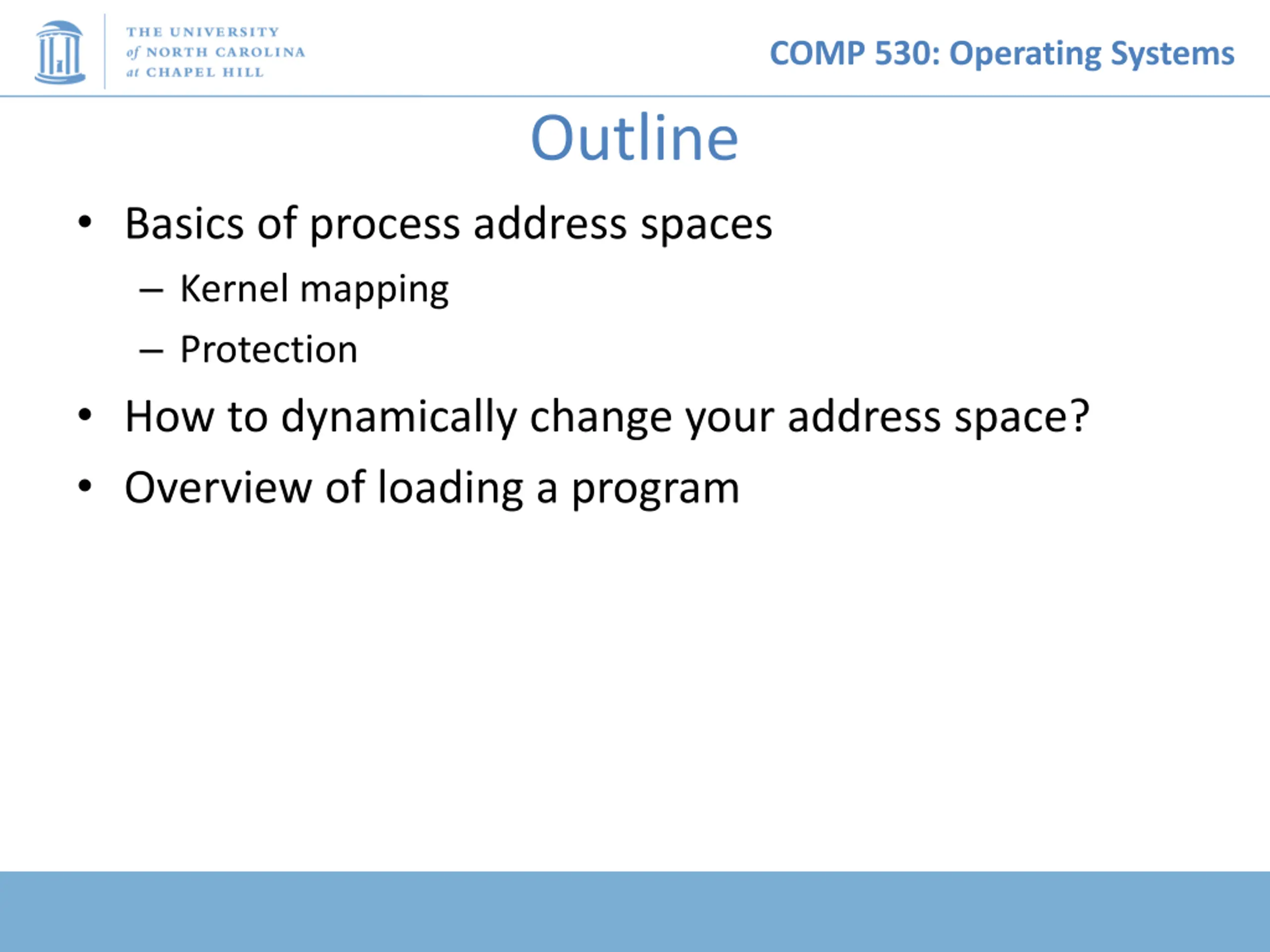 COMP 530: Operating Systems Outline Basics of process address spaces Kernel mapping Protection How to dynamically change your address space? Overview of loading a program