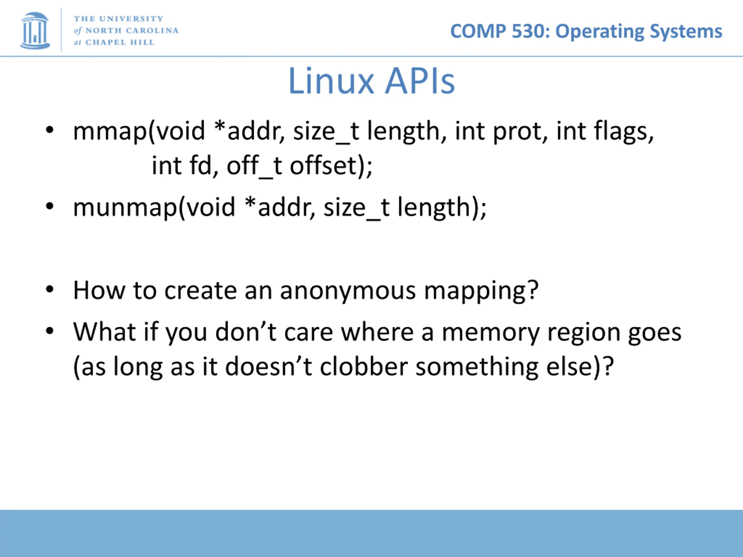 COMP 530: Operating Systems Linux APIs mmap(void *addr, size_t length, int prot, int flags, int fd, off_t offset); munmap(void *addr, size_t length); How to create an anonymous mapping? What if you don t care where a memory region goes (as long as it doesn t clobber something else)?