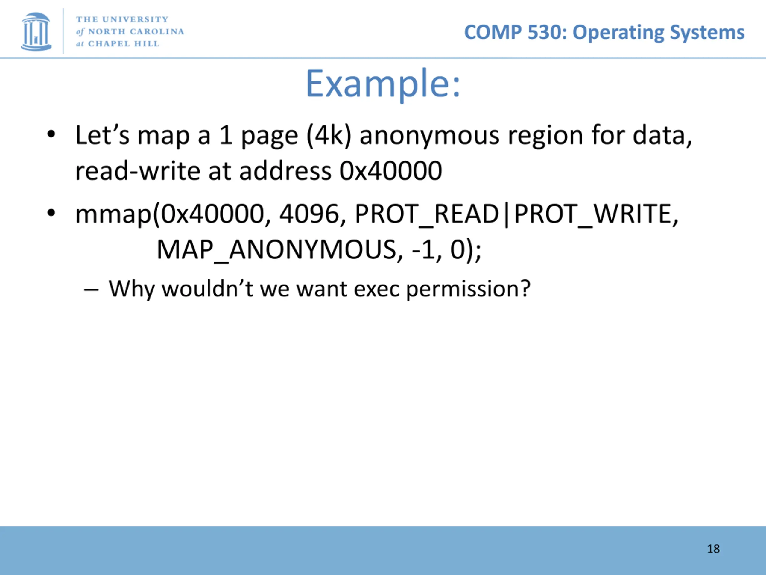 COMP 530: Operating Systems Example: Let s map a 1 page (4k) anonymous region for data, read-write at address 0x40000 mmap(0x40000, 4096, PROT_READ|PROT_WRITE, MAP_ANONYMOUS, -1, 0); Why wouldn t we want exec permission? 18