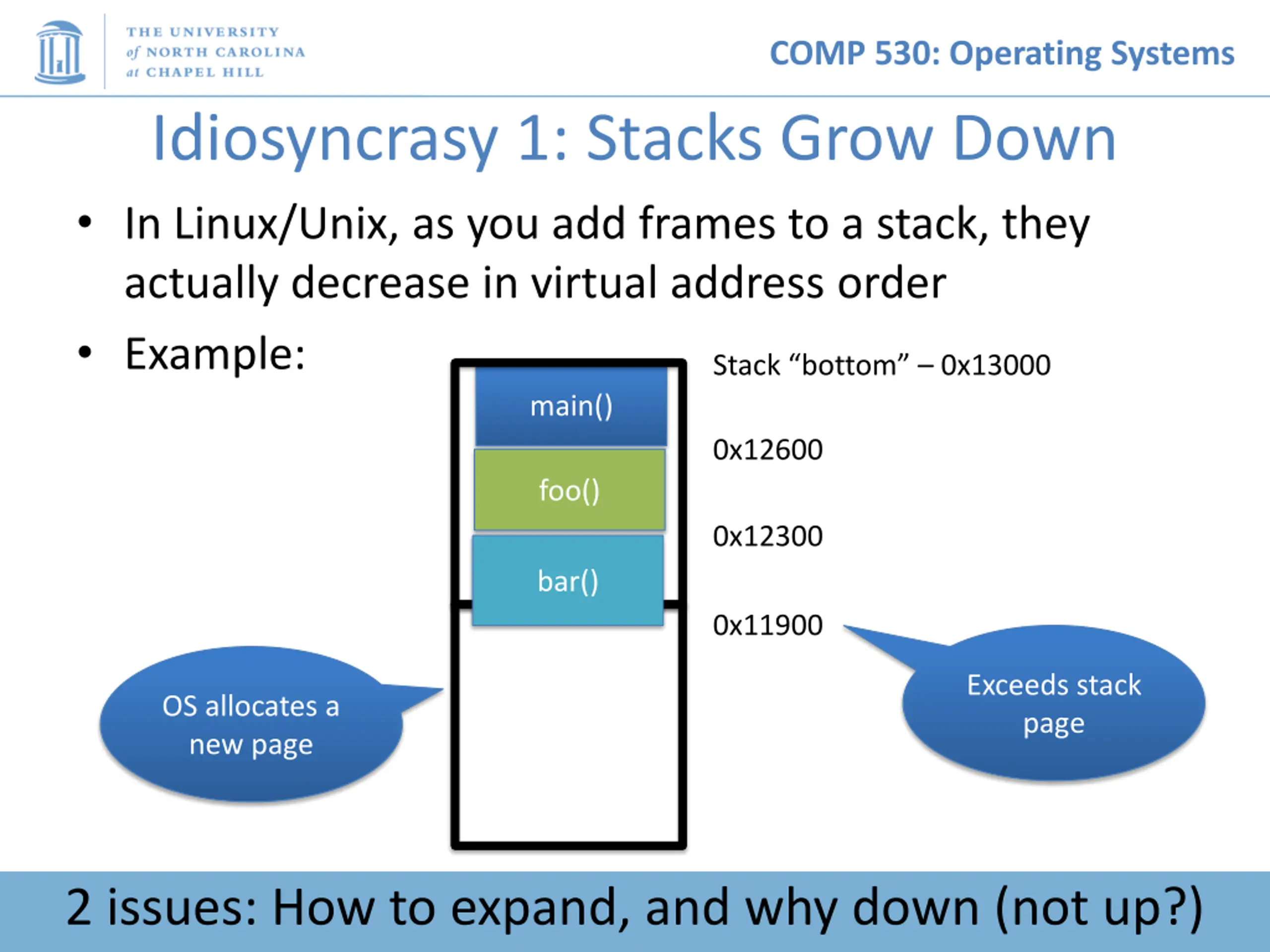 COMP 530: Operating Systems Idiosyncrasy 1: Stacks Grow Down In Linux/Unix, as you add frames to a stack, they actually decrease in virtual address order Example: main() Stack bottom 0x13000 0x12600 foo() 0x12300 bar() 0x11900 Exceeds stack page OS allocates a new page 2 issues: How to expand, and why down (not up?)