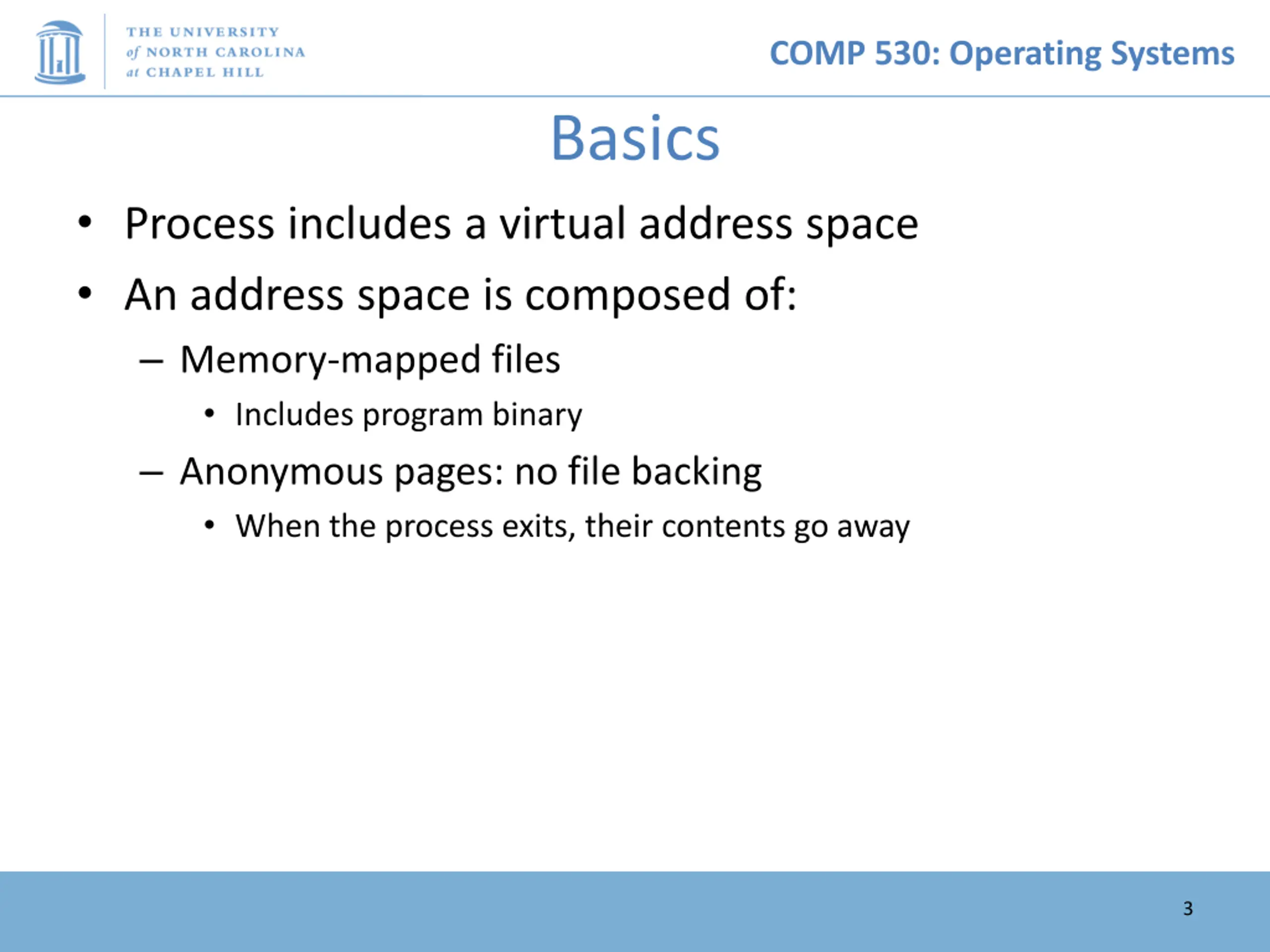 COMP 530: Operating Systems Basics Process includes a virtual address space An address space is composed of: Memory-mapped files Includes program binary Anonymous pages: no file backing When the process exits, their contents go away 3