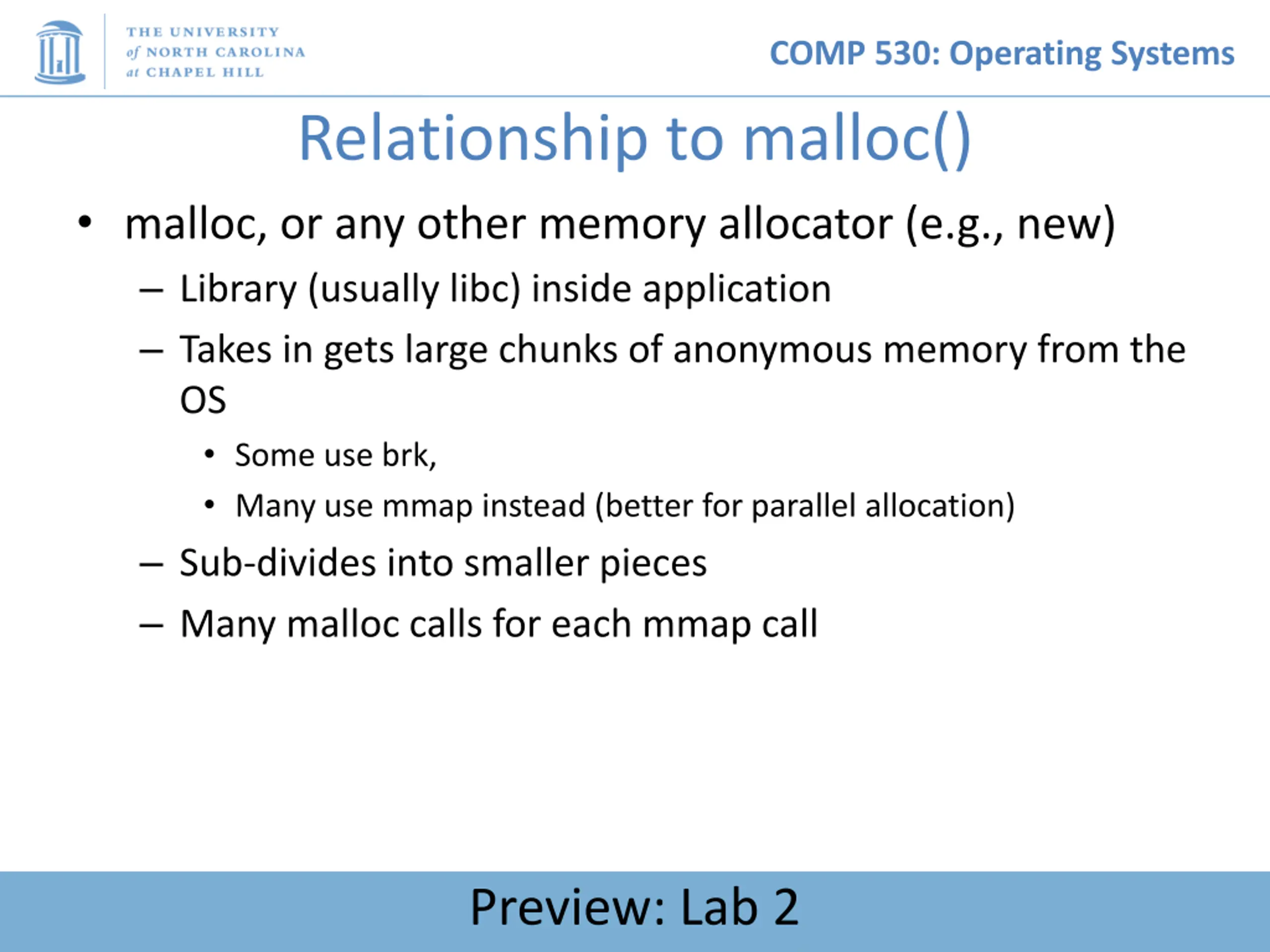 COMP 530: Operating Systems Relationship to malloc() malloc, or any other memory allocator (e.g., new) Library (usually libc) inside application Takes in gets large chunks of anonymous memory from the OS Some use brk, Many use mmap instead (better for parallel allocation) Sub-divides into smaller pieces Many malloc calls for each mmap call Preview: Lab 2