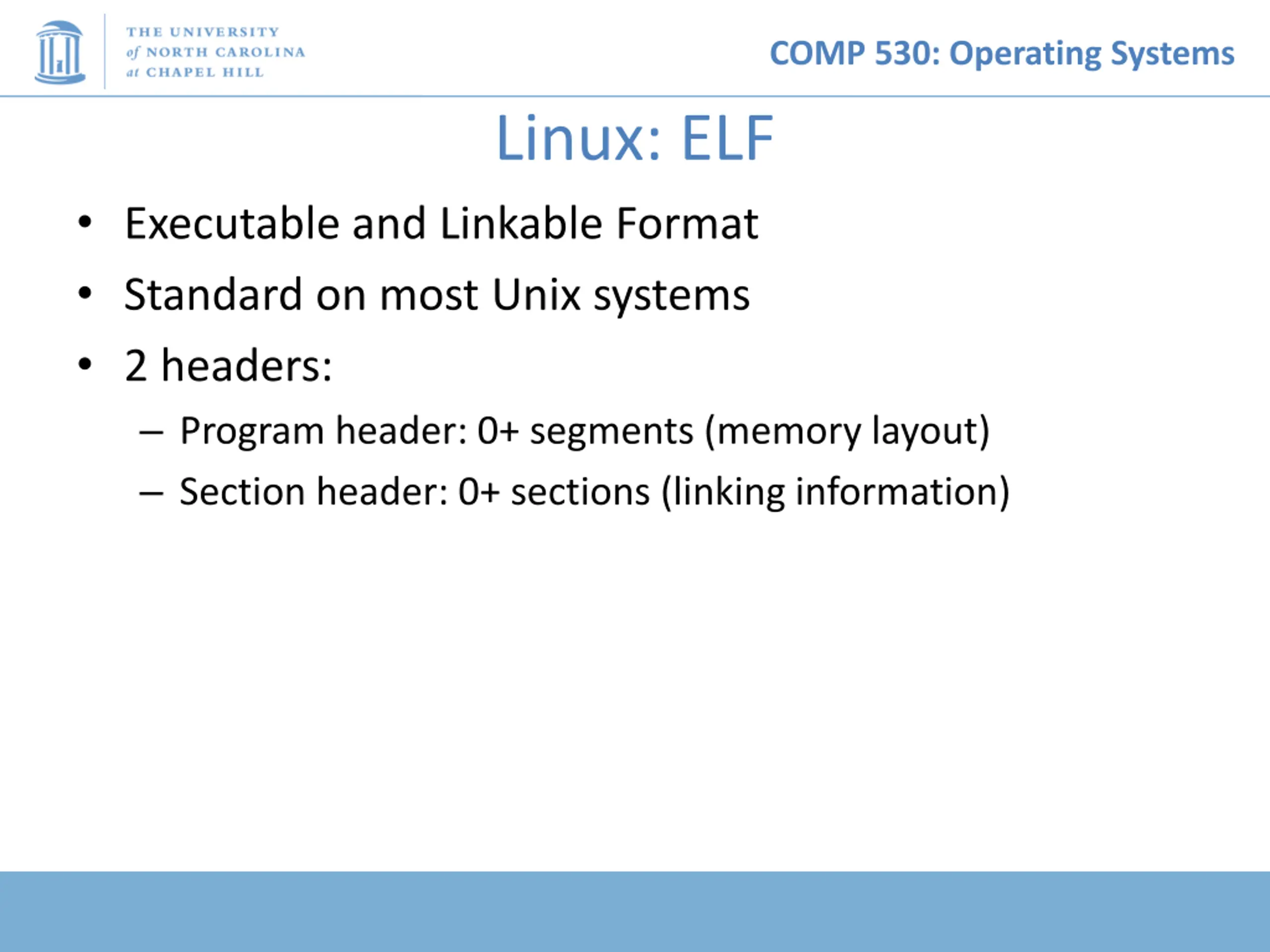 COMP 530: Operating Systems Linux: ELF Executable and Linkable Format Standard on most Unix systems 2 headers: Program header: 0+ segments (memory layout) Section header: 0+ sections (linking information)