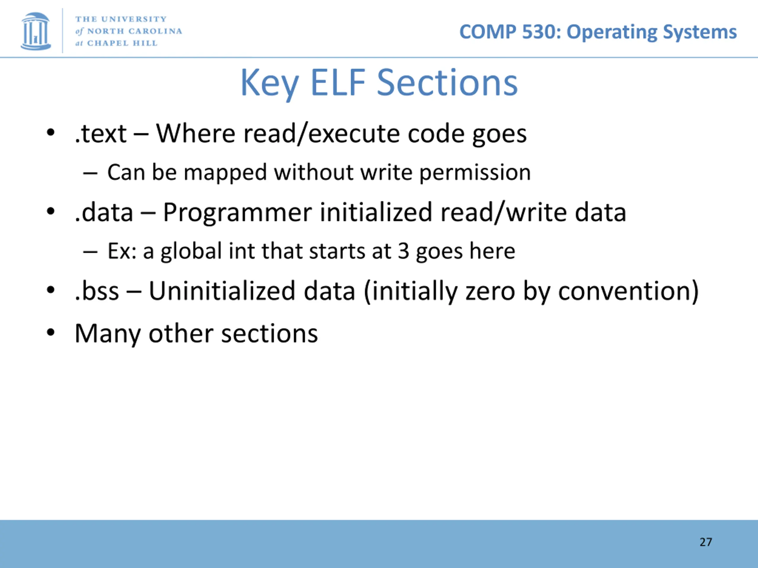COMP 530: Operating Systems Key ELF Sections .text Where read/execute code goes Can be mapped without write permission .data Programmer initialized read/write data Ex: a global int that starts at 3 goes here .bss Uninitialized data (initially zero by convention) Many other sections 27