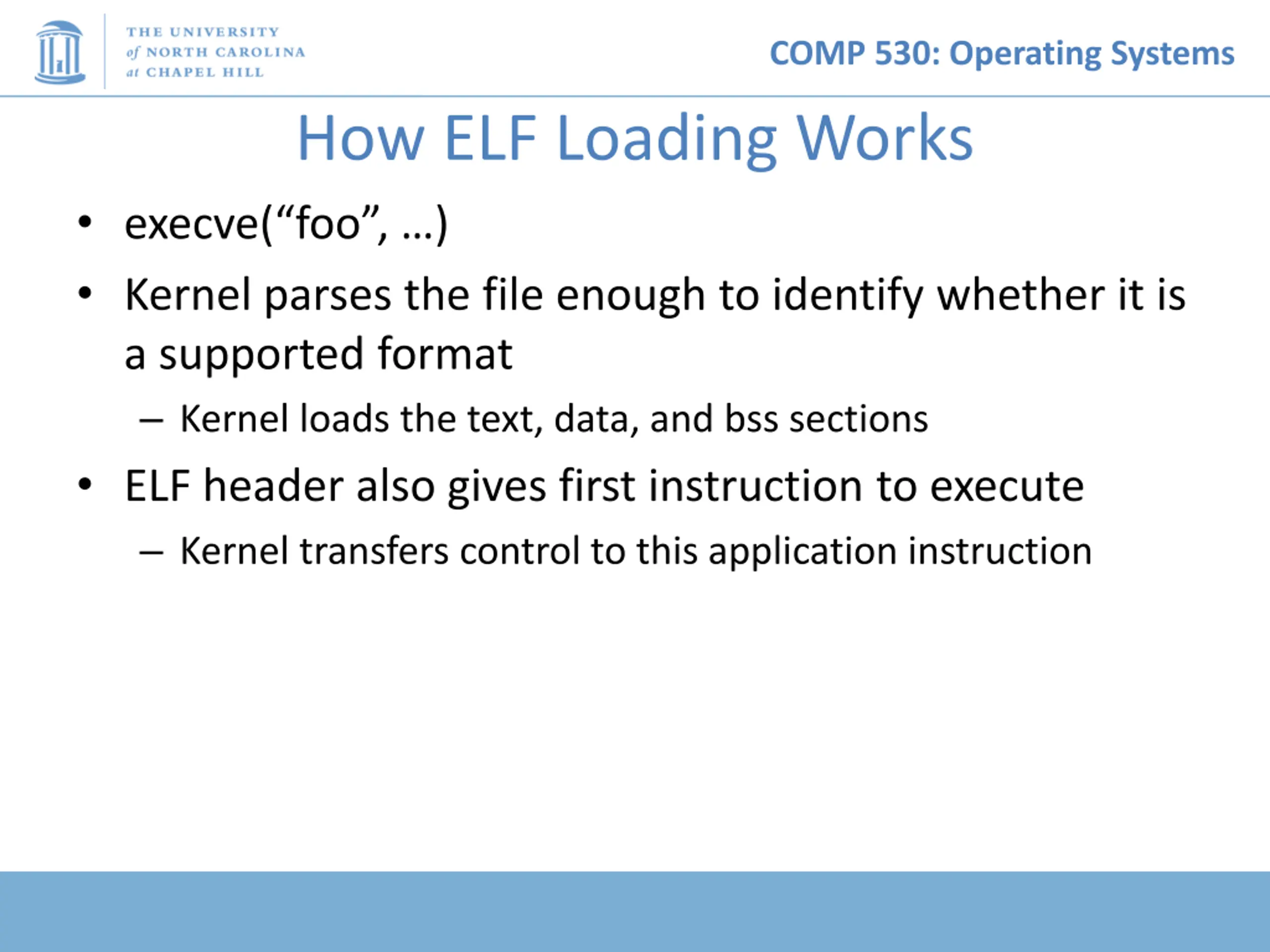 COMP 530: Operating Systems How ELF Loading Works execve( foo , ) Kernel parses the file enough to identify whether it is a supported format Kernel loads the text, data, and bss sections ELF header also gives first instruction to execute Kernel transfers control to this application instruction