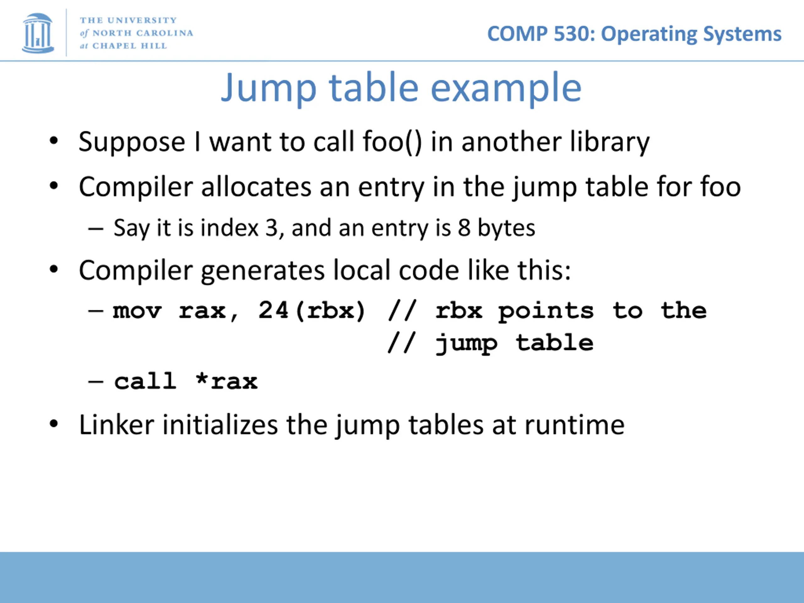 COMP 530: Operating Systems Jump table example Suppose I want to call foo() in another library Compiler allocates an entry in the jump table for foo Say it is index 3, and an entry is 8 bytes Compiler generates local code like this: mov rax, 24(rbx) // rbx points to the // jump table call *rax Linker initializes the jump tables at runtime