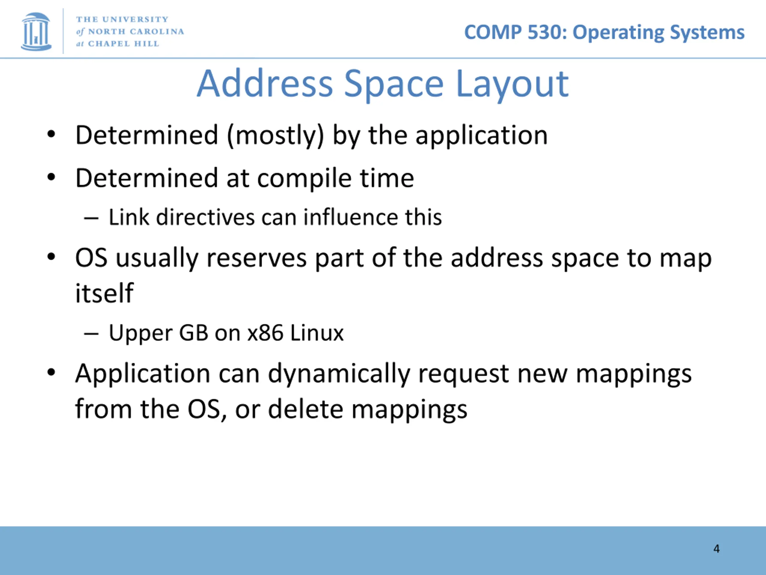 COMP 530: Operating Systems Address Space Layout Determined (mostly) by the application Determined at compile time Link directives can influence this OS usually reserves part of the address space to map itself Upper GB on x86 Linux Application can dynamically request new mappings from the OS, or delete mappings 4
