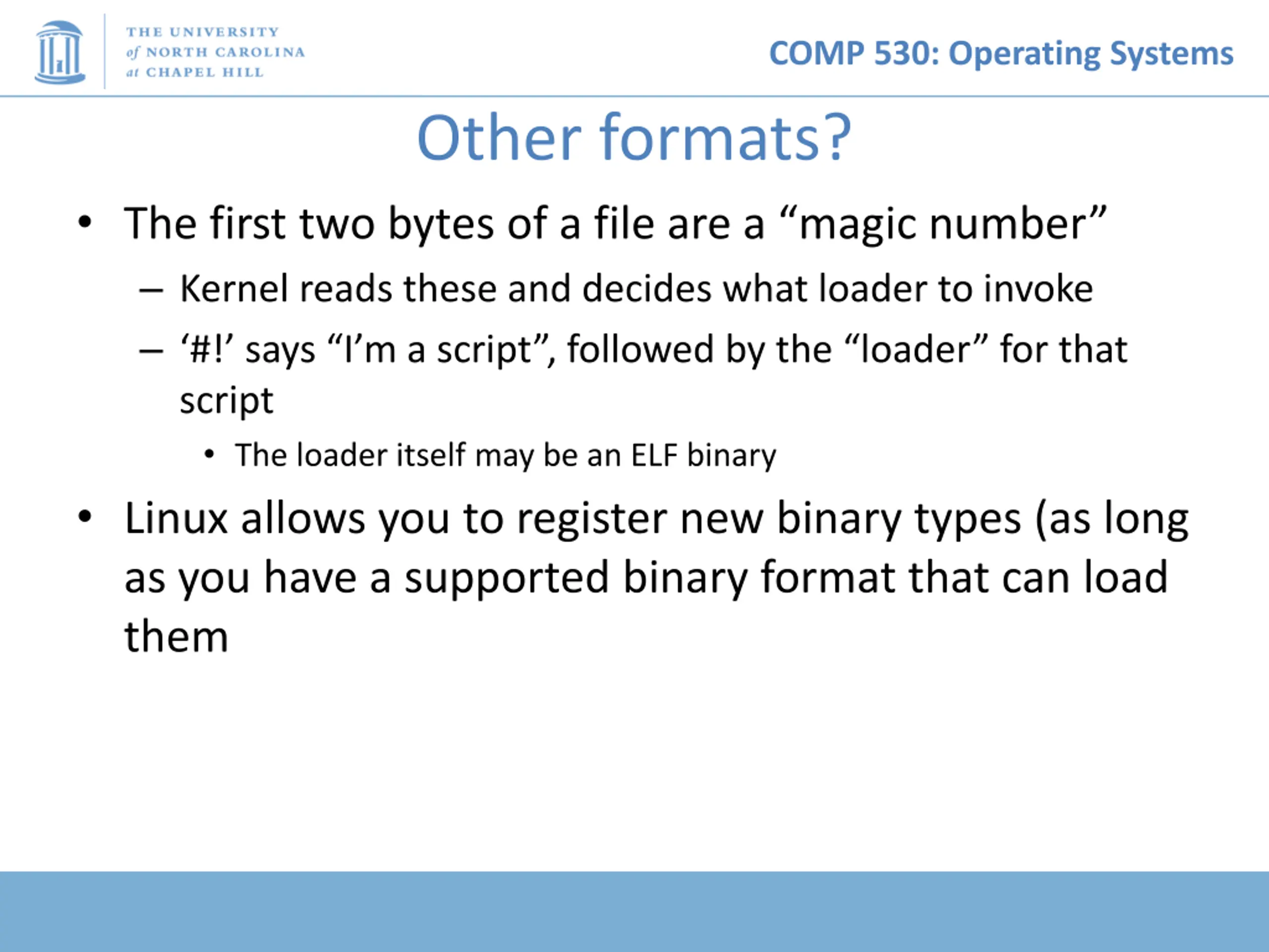 COMP 530: Operating Systems Other formats? The first two bytes of a file are a magic number Kernel reads these and decides what loader to invoke #! says I m a script , followed by the loader for that script The loader itself may be an ELF binary Linux allows you to register new binary types (as long as you have a supported binary format that can load them