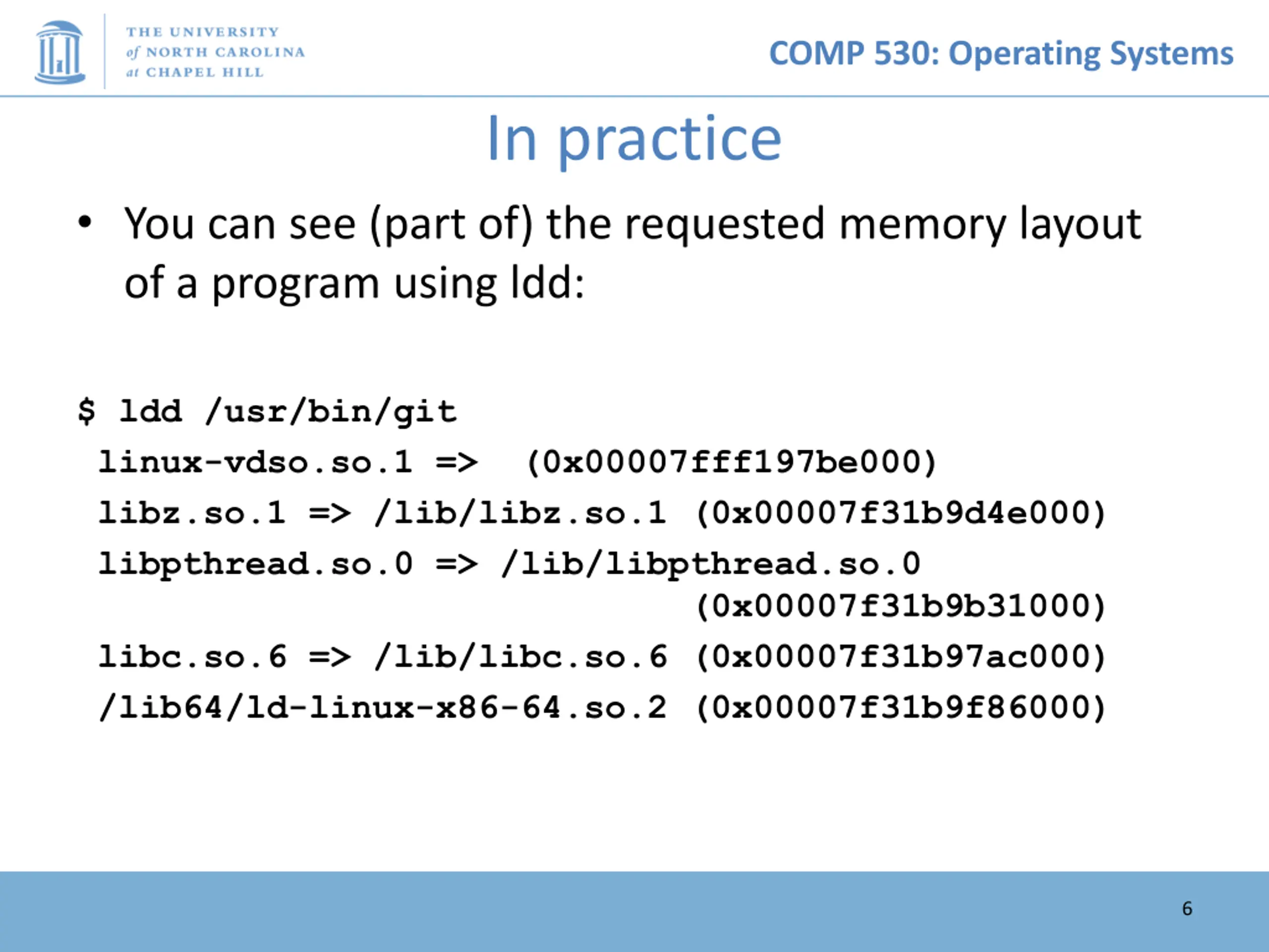 COMP 530: Operating Systems In practice You can see (part of) the requested memory layout of a program using ldd: $ ldd /usr/bin/git linux-vdso.so.1 => (0x00007fff197be000) libz.so.1 => /lib/libz.so.1 (0x00007f31b9d4e000) libpthread.so.0 => /lib/libpthread.so.0 (0x00007f31b9b31000) libc.so.6 => /lib/libc.so.6 (0x00007f31b97ac000) /lib64/ld-linux-x86-64.so.2 (0x00007f31b9f86000) 6