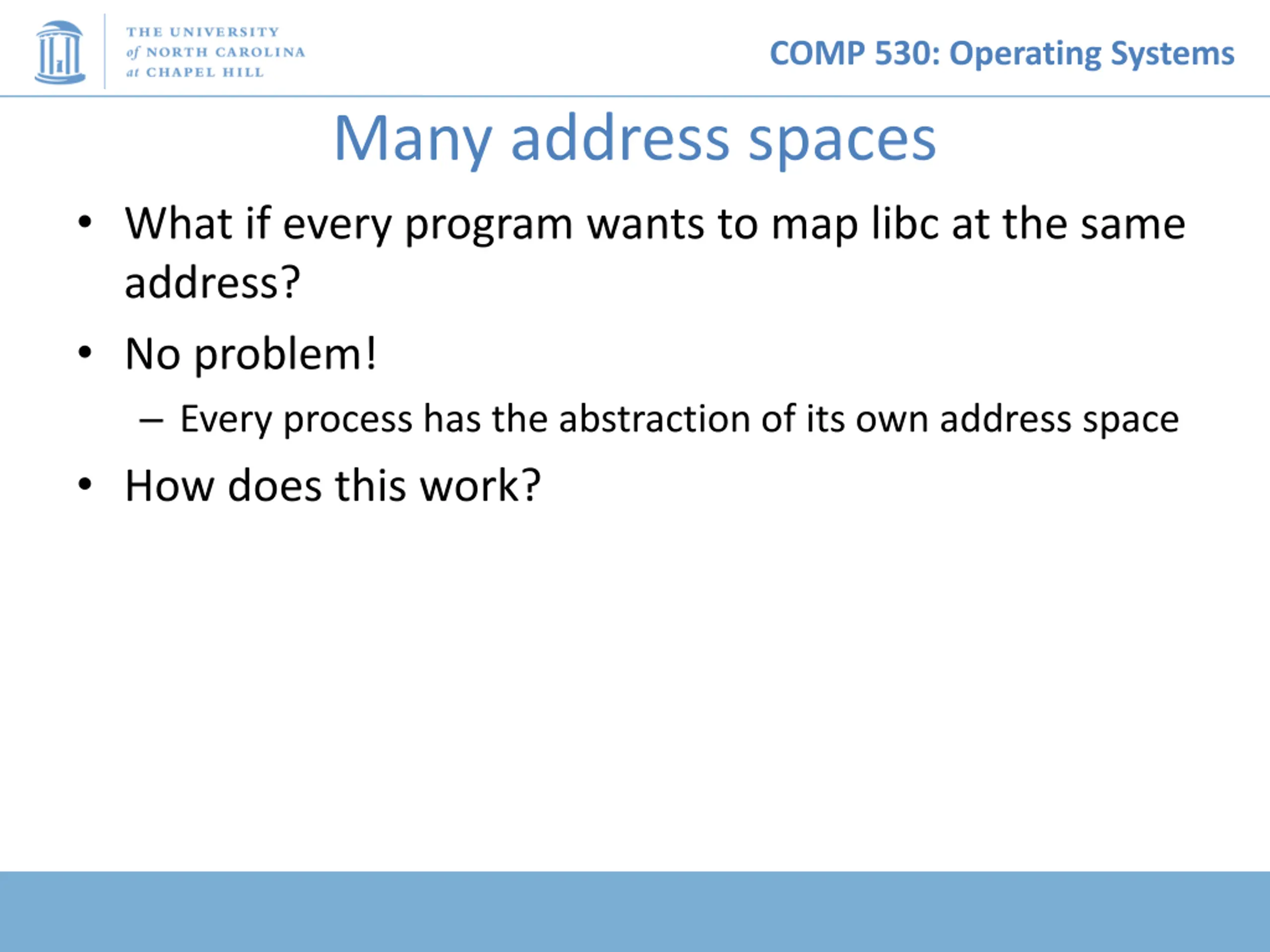 COMP 530: Operating Systems Many address spaces What if every program wants to map libc at the same address? No problem! Every process has the abstraction of its own address space How does this work?