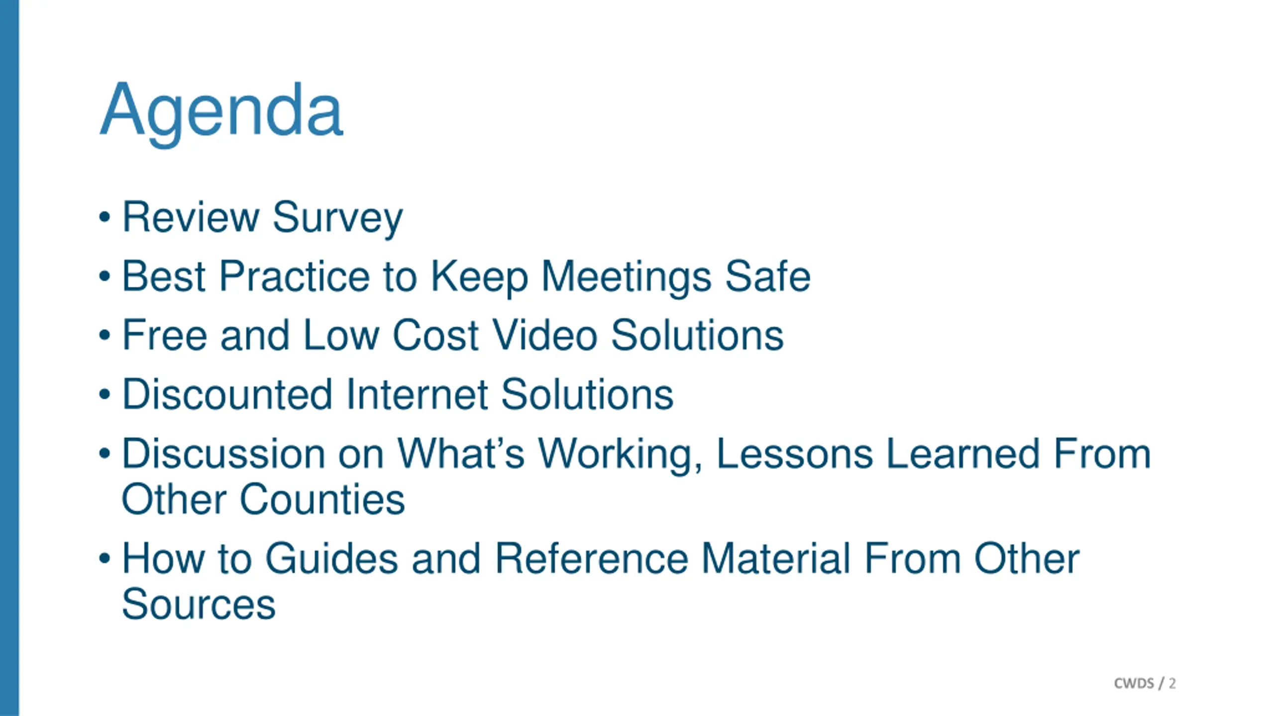 Agenda Review Survey Best Practice to Keep Meetings Safe Free and Low Cost Video Solutions Discounted Internet Solutions Discussion on What s Working, Lessons Learned From Other Counties How to Guides and Reference Material From Other Sources CWDS / 2