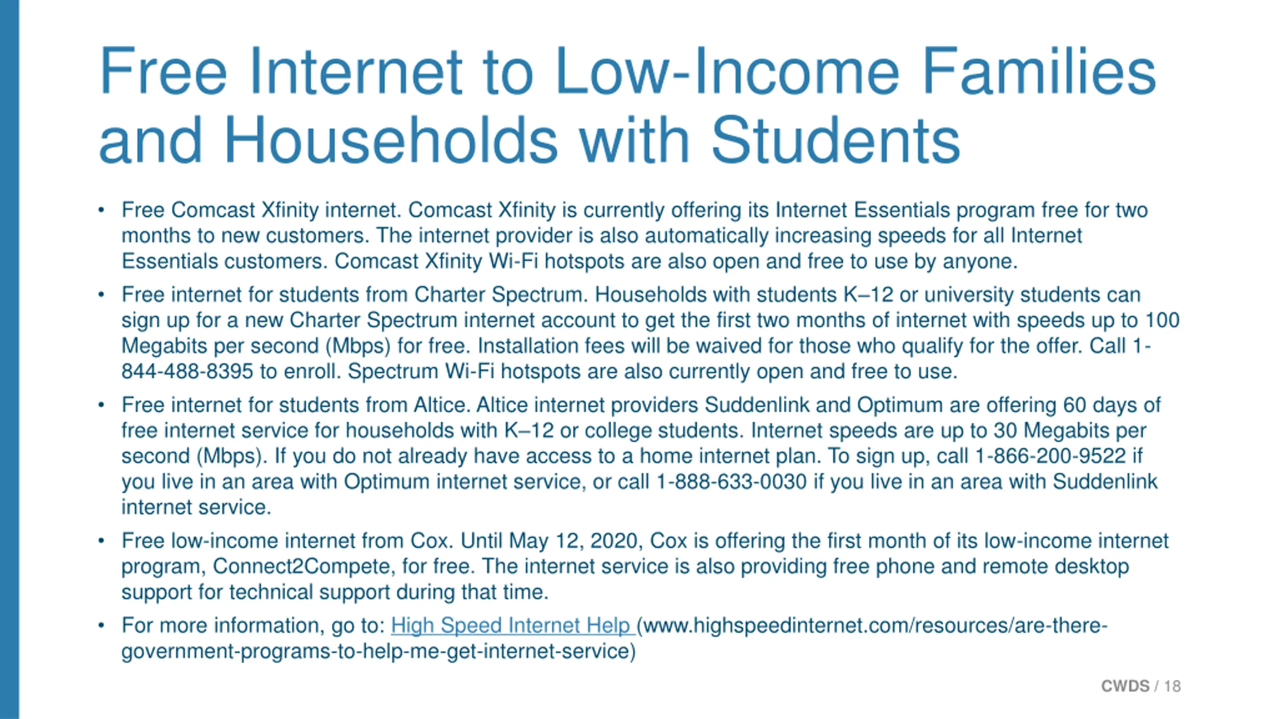 Free Internet to Low-Income Families and Households with Students Free Comcast Xfinity internet. Comcast Xfinity is currently offering its Internet Essentials program free for two months to new customers. The internet provider is also automatically increasing speeds for all Internet Essentials customers. Comcast Xfinity Wi-Fi hotspots are also open and free to use by anyone. Free internet for students from Charter Spectrum. Households with students K 12 or university students can sign up for a new Charter Spectrum internet account to get the first two months of internet with speeds up to 100 Megabits per second (Mbps) for free. Installation fees will be waived for those who qualify for the offer. Call 1- 844-488-8395 to enroll. Spectrum Wi-Fi hotspots are also currently open and free to use. Free internet for students from Altice. Altice internet providers Suddenlink and Optimum are offering 60 days of free internet service for households with K 12 or college students. Internet speeds are up to 30 Megabits per second (Mbps). If you do not already have access to a home internet plan. To sign up, call 1-866-200-9522 if you live in an area with Optimum internet service, or call 1-888-633-0030 if you live in an area with Suddenlink internet service. Free low-income internet from Cox. Until May 12, 2020, Cox is offering the first month of its low-income internet program, Connect2Compete, for free. The internet service is also providing free phone and remote desktop support for technical support during that time. For more information, go to: High Speed Internet Help (www.highspeedinternet.com/resources/are-there- government-programs-to-help-me-get-internet-service) CWDS / 18