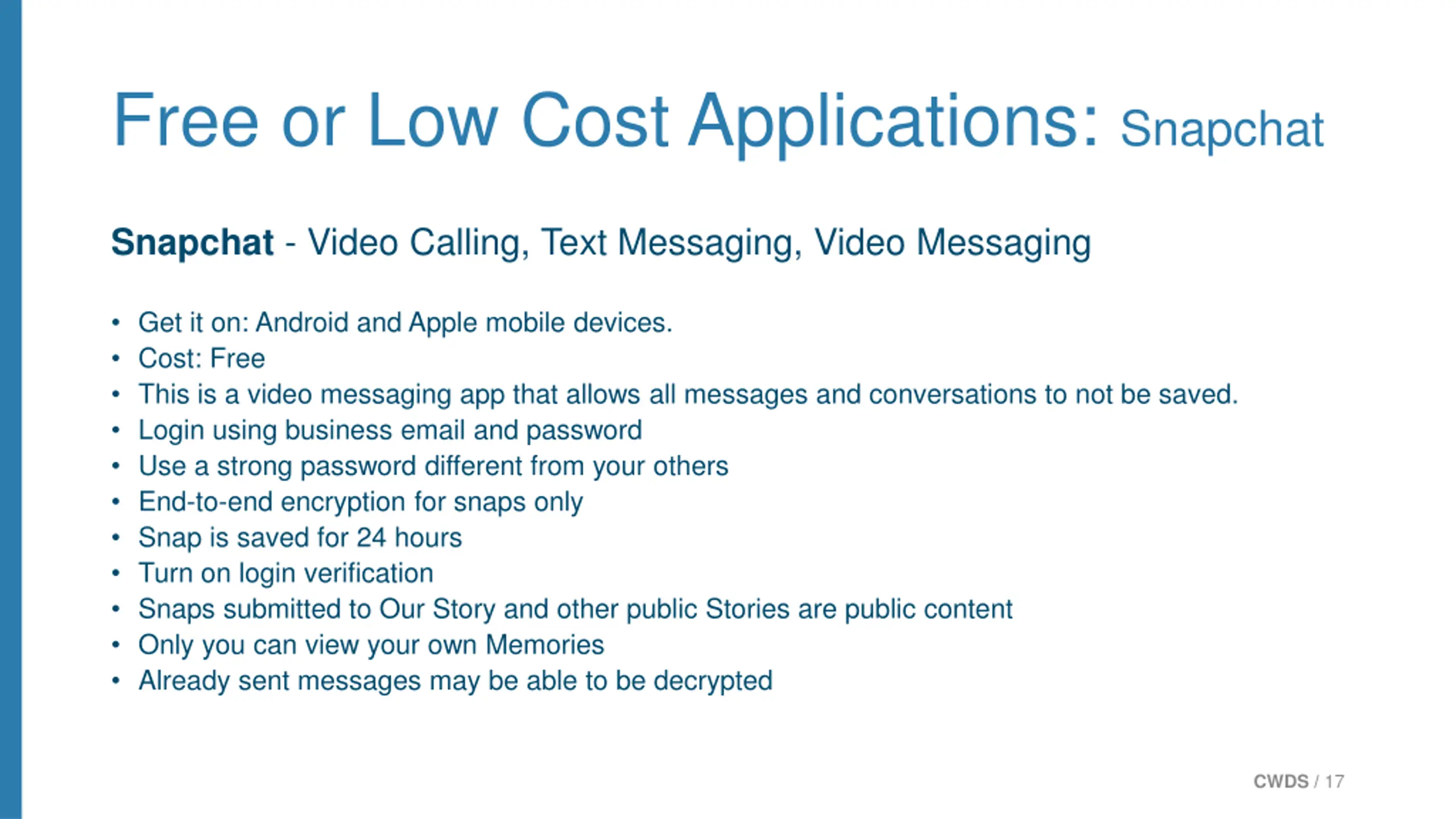 Free or Low Cost Applications: Snapchat Snapchat - Video Calling, Text Messaging, Video Messaging Get it on: Android and Apple mobile devices. Cost: Free This is a video messaging app that allows all messages and conversations to not be saved. Login using business email and password Use a strong password different from your others End-to-end encryption for snaps only Snap is saved for 24 hours Turn on login verification Snaps submitted to Our Story and other public Stories are public content Only you can view your own Memories Already sent messages may be able to be decrypted CWDS / 17