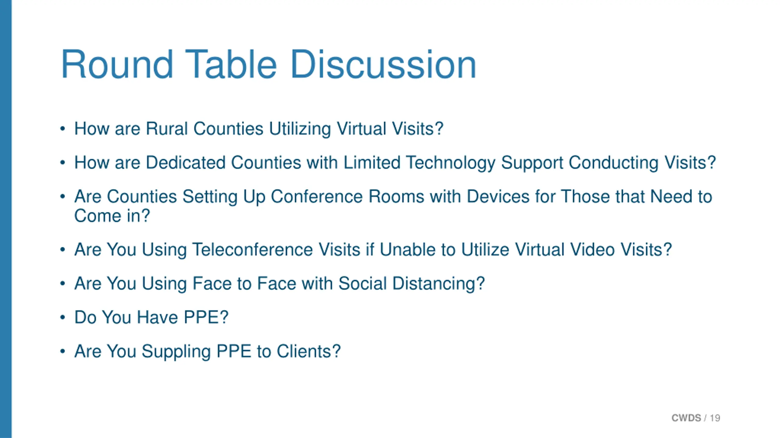 Round Table Discussion How are Rural Counties Utilizing Virtual Visits? How are Dedicated Counties with Limited Technology Support Conducting Visits? Are Counties Setting Up Conference Rooms with Devices for Those that Need to Come in? Are You Using Teleconference Visits if Unable to Utilize Virtual Video Visits? Are You Using Face to Face with Social Distancing? Do You Have PPE? Are You Suppling PPE to Clients? CWDS / 19