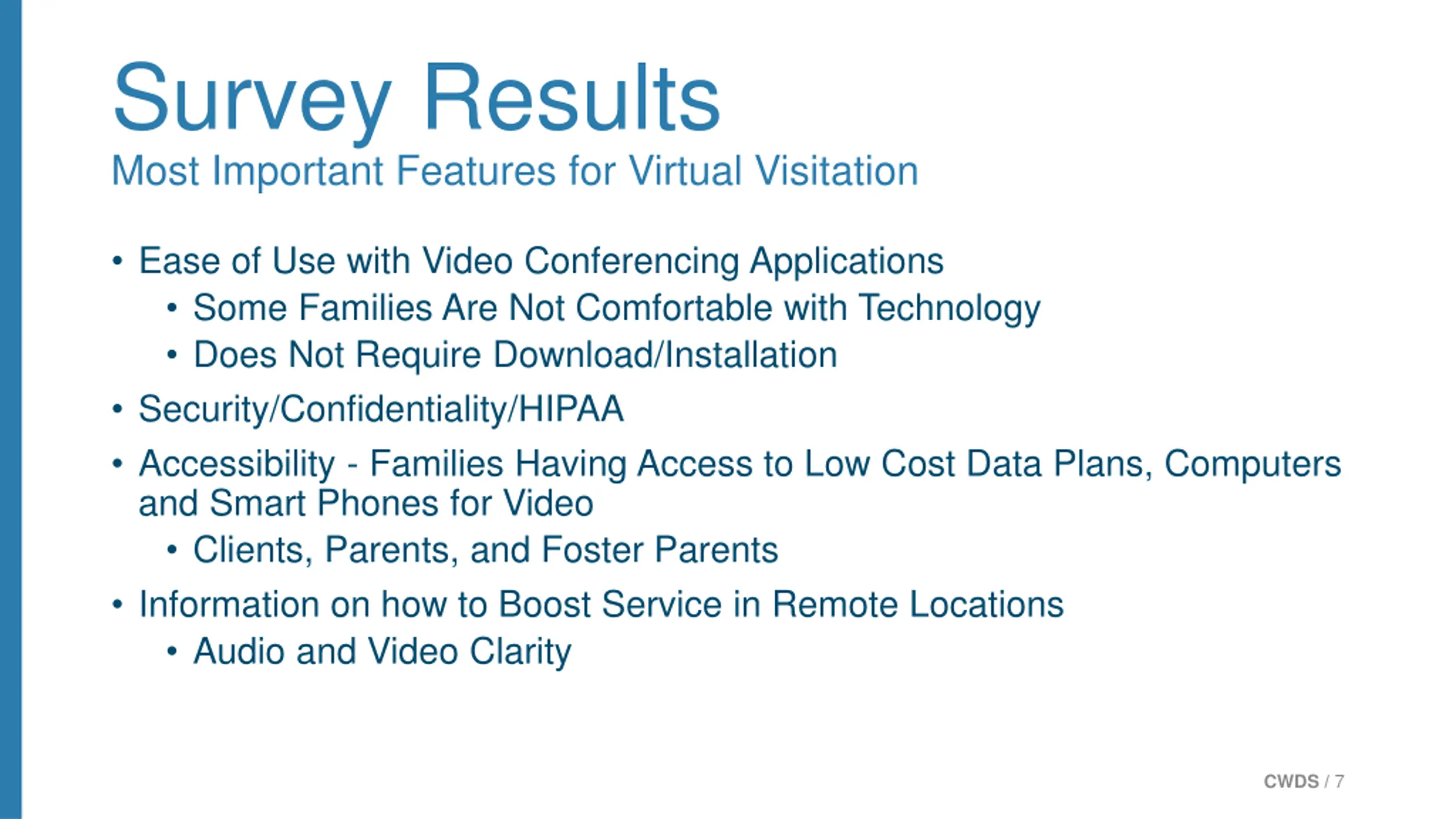Survey Results Most Important Features for Virtual Visitation Ease of Use with Video Conferencing Applications Some Families Are Not Comfortable with Technology Does Not Require Download/Installation Security/Confidentiality/HIPAA Accessibility - Families Having Access to Low Cost Data Plans, Computers and Smart Phones for Video Clients, Parents, and Foster Parents Information on how to Boost Service in Remote Locations Audio and Video Clarity CWDS / 7