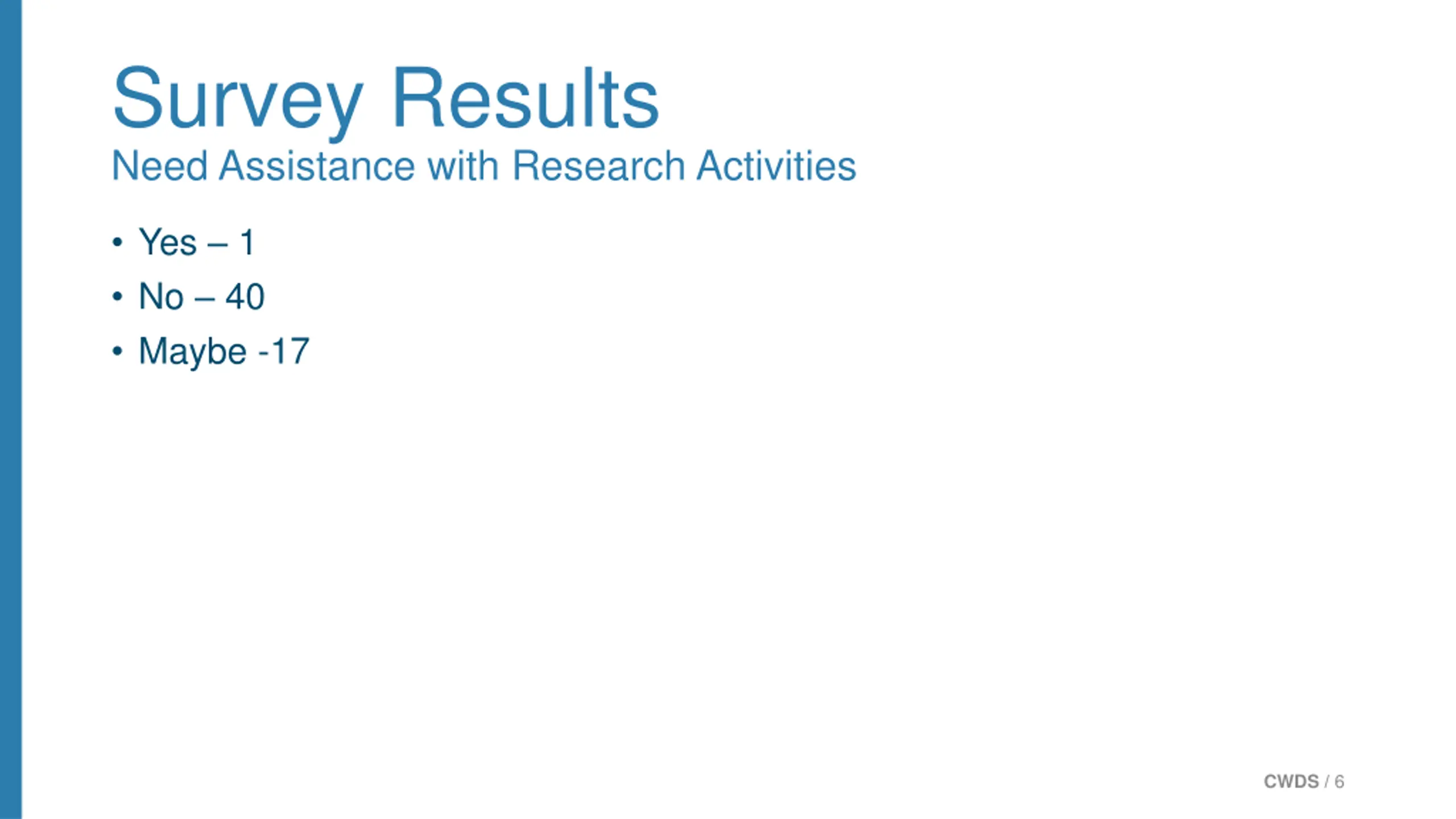 Survey Results Need Assistance with Research Activities Yes 1 No 40 Maybe -17 CWDS / 6