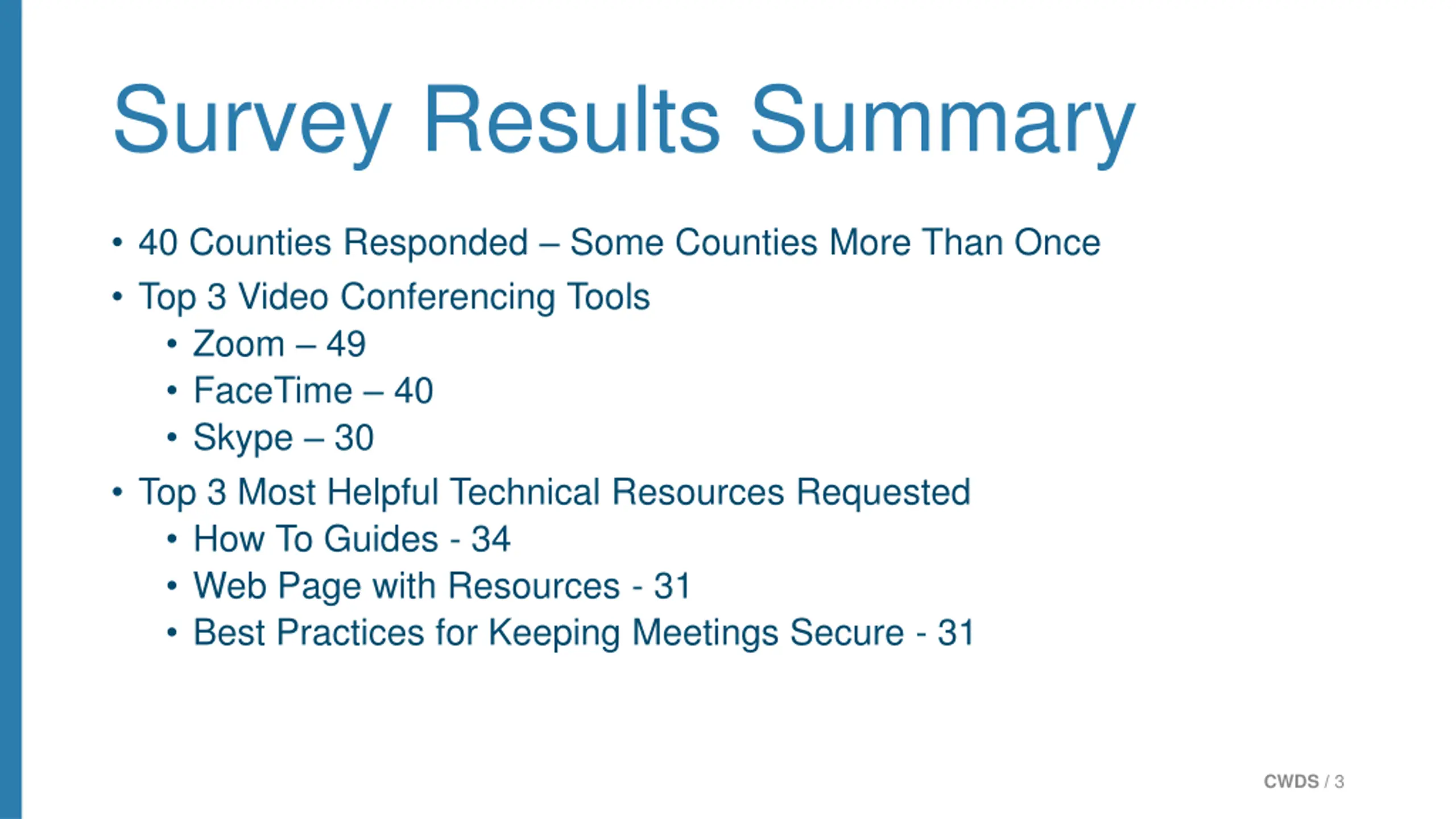 Survey Results Summary 40 Counties Responded Some Counties More Than Once Top 3 Video Conferencing Tools Zoom 49 FaceTime 40 Skype 30 Top 3 Most Helpful Technical Resources Requested How To Guides - 34 Web Page with Resources - 31 Best Practices for Keeping Meetings Secure - 31 CWDS / 3