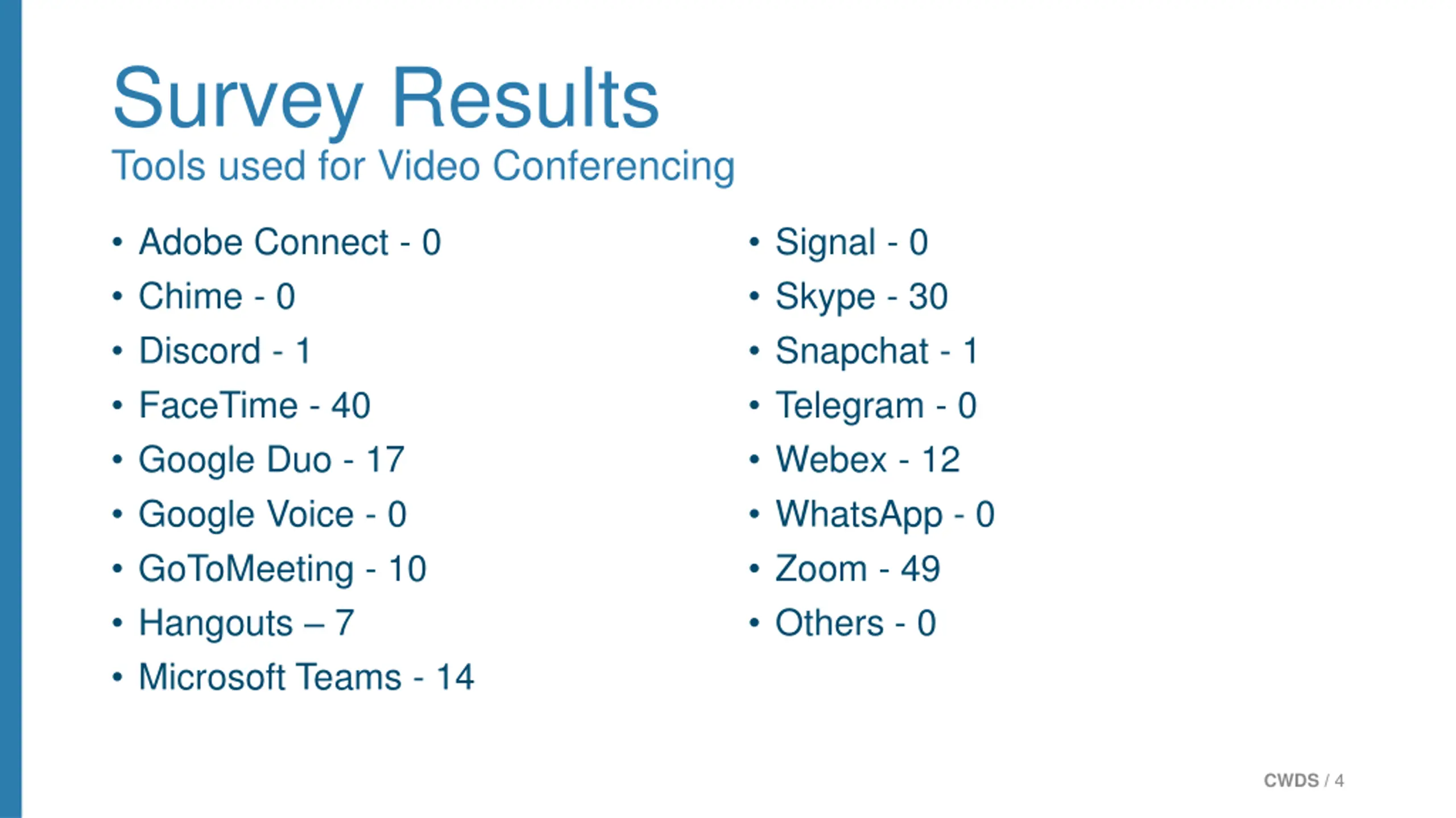 Survey Results Tools used for Video Conferencing Adobe Connect - 0 Chime - 0 Discord - 1 FaceTime - 40 Google Duo - 17 Google Voice - 0 GoToMeeting - 10 Hangouts 7 Microsoft Teams - 14 Signal - 0 Skype - 30 Snapchat - 1 Telegram - 0 Webex - 12 WhatsApp - 0 Zoom - 49 Others - 0 CWDS / 4