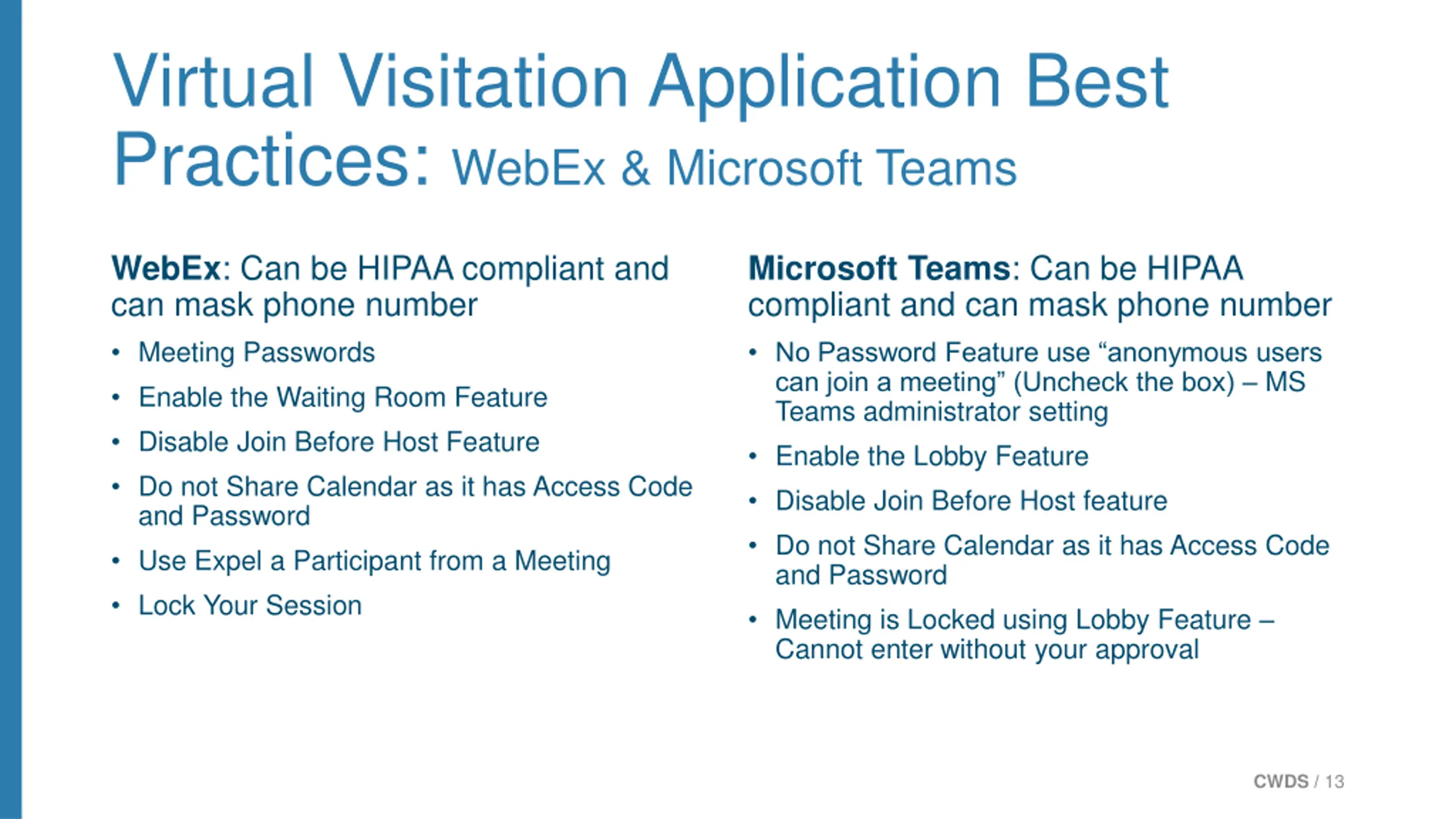 Virtual Visitation Application Best Practices: WebEx & Microsoft Teams WebEx: Can be HIPAA compliant and can mask phone number Meeting Passwords Enable the Waiting Room Feature Disable Join Before Host Feature Do not Share Calendar as it has Access Code and Password Use Expel a Participant from a Meeting Lock Your Session Microsoft Teams: Can be HIPAA compliant and can mask phone number No Password Feature use anonymous users can join a meeting (Uncheck the box) MS Teams administrator setting Enable the Lobby Feature Disable Join Before Host feature Do not Share Calendar as it has Access Code and Password Meeting is Locked using Lobby Feature Cannot enter without your approval CWDS / 13