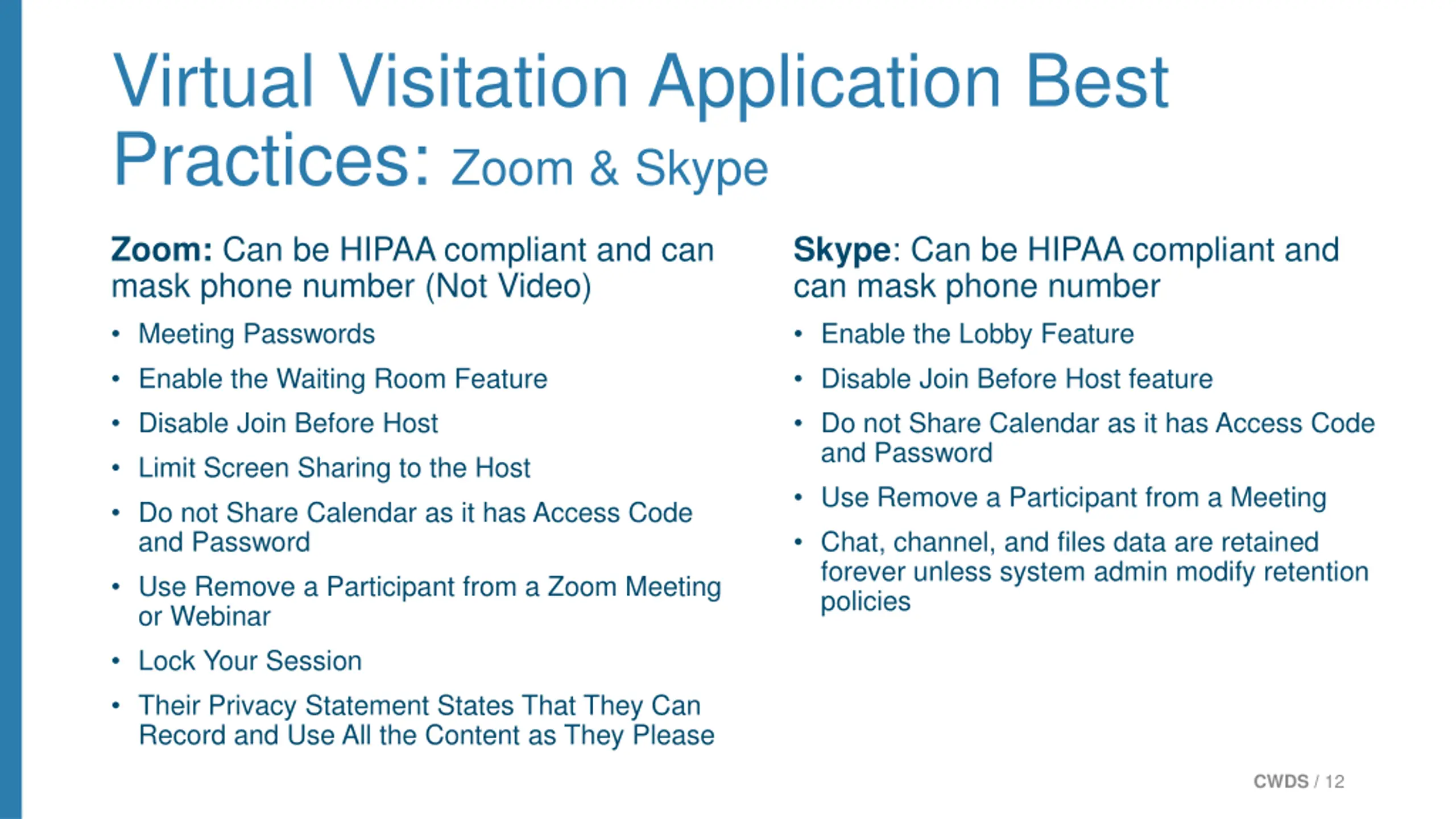 Virtual Visitation Application Best Practices: Zoom & Skype Zoom: Can be HIPAA compliant and can mask phone number (Not Video) Meeting Passwords Enable the Waiting Room Feature Disable Join Before Host Limit Screen Sharing to the Host Do not Share Calendar as it has Access Code and Password Use Remove a Participant from a Zoom Meeting or Webinar Lock Your Session Their Privacy Statement States That They Can Record and Use All the Content as They Please Skype: Can be HIPAA compliant and can mask phone number Enable the Lobby Feature Disable Join Before Host feature Do not Share Calendar as it has Access Code and Password Use Remove a Participant from a Meeting Chat, channel, and files data are retained forever unless system admin modify retention policies CWDS / 12