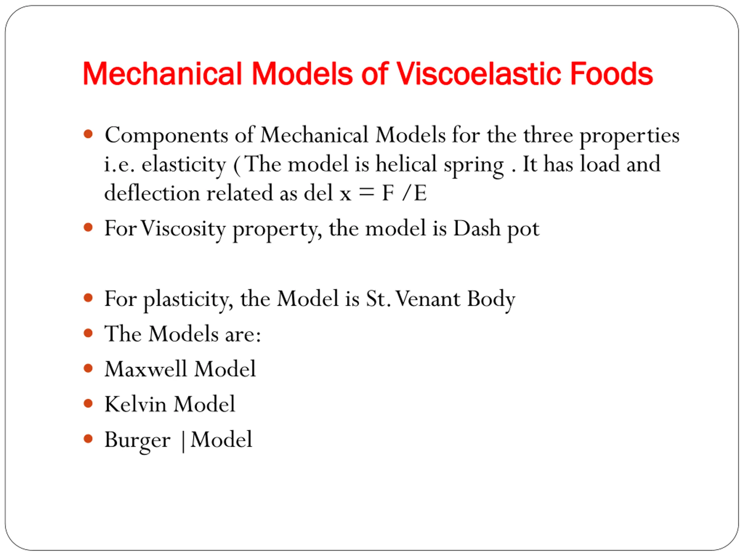 Mechanical Models of Mechanical Models of Viscoelastic Viscoelastic Foods Foods Components of Mechanical Models for the three properties i.e. elasticity ( The model is helical spring . It has load and deflection related as del x = F /E For Viscosity property, the model is Dash pot For plasticity, the Model is St. Venant Body The Models are: Maxwell Model Kelvin Model Burger |Model